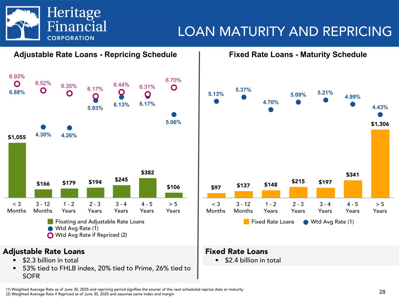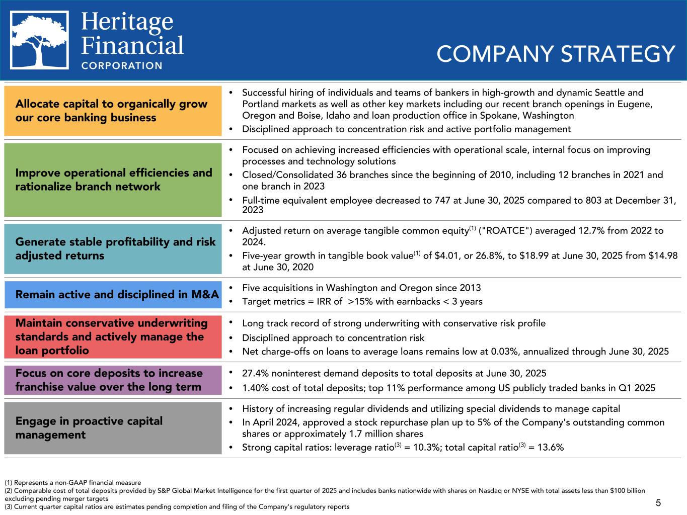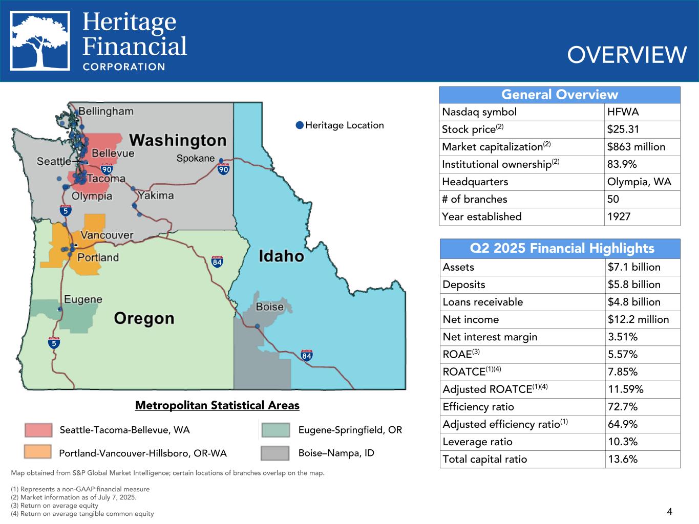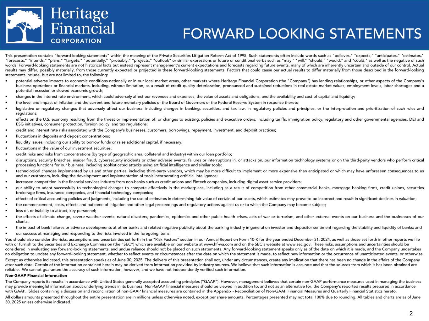 2本演示文稿包含1995年《私人证券诉讼改革法案》含义内的“前瞻性陈述”。此类陈述通常包括诸如“相信”、“预期”、“预期”、“估计”、“预测”、“打算”、“计划”、“目标”、“潜在”、“可能”、“项目”、“展望”或类似表达方式或未来或条件动词,如“可能”、“将”、“应该”、“将”和“可以”等词语,以及此类词语的否定。前瞻性陈述不是历史事实,而是代表管理层当前对未来事件的预期和预测,其中许多事件本质上是不确定的,超出了我们的控制范围。实际结果可能与这些前瞻性陈述中目前预期或预测的结果存在重大差异。可能导致我们的实际结果与前瞻性陈述中描述的结果存在重大差异的因素包括但不限于:•对国家或我们当地市场区域的经济状况、Heritage Financial Corporation(“公司”)存在借贷关系的其他市场或公司业务运营或金融市场其他方面的潜在不利影响,包括但不限于由于信贷质量恶化、房地产市场价值显着和持续降低、就业水平、劳动力短缺和潜在的衰退或经济增长放缓;•利率环境的变化,这可能会对我们的收入和支出、资产和债务的价值以及资本和流动性的可用性和成本产生不利影响;•通货膨胀的水平和影响以及联邦储备系统理事会应对这些变化的当前和未来货币政策;•对我们的业务产生不利影响的立法或监管变化,包括监管政策和原则方面的银行、证券和税法的变化,或此类规则和法规的解释和优先排序;•现有政策和行政命令,包括关税、移民政策、监管和其他政府机构、DEI和ESG倡议、消费者保护、外交政策和税收法规,受到威胁或实施或发生变化,对美国经济产生影响;•与公司业务、客户、借款、还款、投资和存款实践相关的信用和利率风险;•存款和存款集中度的波动;•流动性问题,包括我们借入资金或筹集额外资金的能力,如有必要;•我们投资证券价值的波动;•信贷风险和来自我们贷款组合中集中度(按地理区域类型、抵押品和行业)的风险;•中断、安全漏洞、内部欺诈、网络安全事件或其他不良事件,我们的信息技术系统或对为我们的业务执行关键处理功能的第三方供应商的故障或中断或攻击,包括使用人工智能和类似工具进行的复杂攻击;•我们和其他方(包括第三方供应商)实施的技术变革,这可能比预期的更难实施或成本更高,或可能对我们和我们的客户产生不可预见的后果,包括开发和实施包含人工智能的工具;•金融服务行业中来自信用合作社和金融科技公司等非银行的竞争加剧,包括数字资产服务提供商;•我们成功适应技术变化以在市场上有效竞争的能力,包括来自其他商业银行、抵押银行公司、信用合作社、证券经纪公司、保险公司的竞争,和金融科技公司;•关键会计政策和判断的影响,包括在确定我们某些资产的公允价值时使用估计,这些估计可能被证明是不正确的,并导致估值大幅下降;•针对我们或公司可能受到的诉讼和其他法律诉讼和监管行动的开始、成本、影响和结果;•关键人员的流失或无法吸引;•气候变化、恶劣天气事件、自然灾害、流行病、流行病和其他公共卫生危机、战争或恐怖主义行为的影响, 和其他外部事件对我们的业务和我们客户的业务的影响;•银行倒闭或其他银行的不利发展以及有关银行业的总体负面宣传对投资者和储户关于银行稳定性和流动性的情绪的影响;•我们成功地管理和应对了上述项目所涉及的风险。您还应考虑我们截至2024年12月31日止年度的10-K表格年度报告中“风险因素”部分所述的风险、假设和不确定性,以及我们向美国证券交易委员会(“SEC”)提交或提供的其他报告中所述的风险、假设和不确定性,这些报告可在我们的网站www.hf-wa.com和SEC的网站www.sec.gov上查阅。在评估任何前瞻性陈述时应考虑这些风险、假设和不确定性,不应过分依赖此类陈述。任何前瞻性陈述仅在作出之日发表,公司不承担更新任何前瞻性陈述的义务,无论是否反映作出陈述之日之后的事件或情况,以反映新信息或意外事件的发生,或以其他方式。除另有说明外,本演示文稿截至2025年6月30日。在任何情况下,本演示文稿的交付不会产生任何暗示,表明在该日期之后公司的事务没有任何变化。此处包含的某些信息可能来自行业来源提供的信息。我们认为,这些信息是准确的,获得信息的来源是可靠的。然而,我们无法保证此类信息的准确性,我们也没有对此类信息进行独立核实。非美国通用会计准则财务信息公司根据美国公认会计原则(“GAAP”)报告业绩。然而,管理层认为,在管理业务时使用的某些非公认会计准则绩效衡量标准可能会提供有关其业务基本趋势的有意义的信息。非GAAP财务指标应被视为公司根据GAAP编制的报告业绩的补充,而不是替代。包含非GAAP财务指标的讨论和调节的幻灯片包含在附录-非GAAP财务指标和季度财务统计的调节中。除非另有说明,否则整个演示文稿中显示的所有美元金额均以百万为单位,每股金额除外。由于四舍五入,列报的百分比总和可能不是100%。除非另有说明,所有表格和图表截至2025年6月30日。前瞻性陈述
