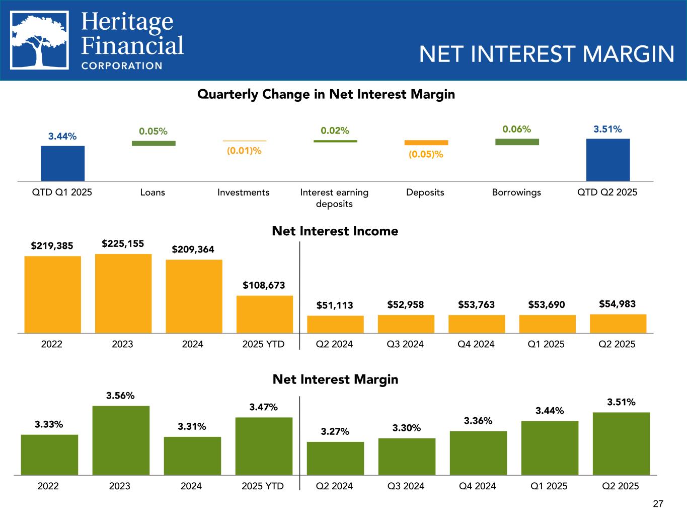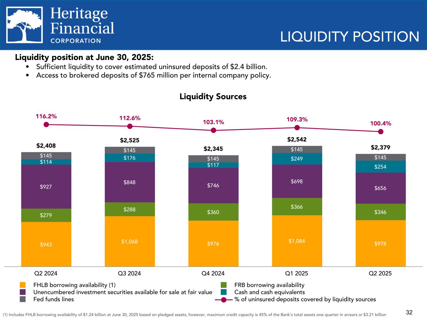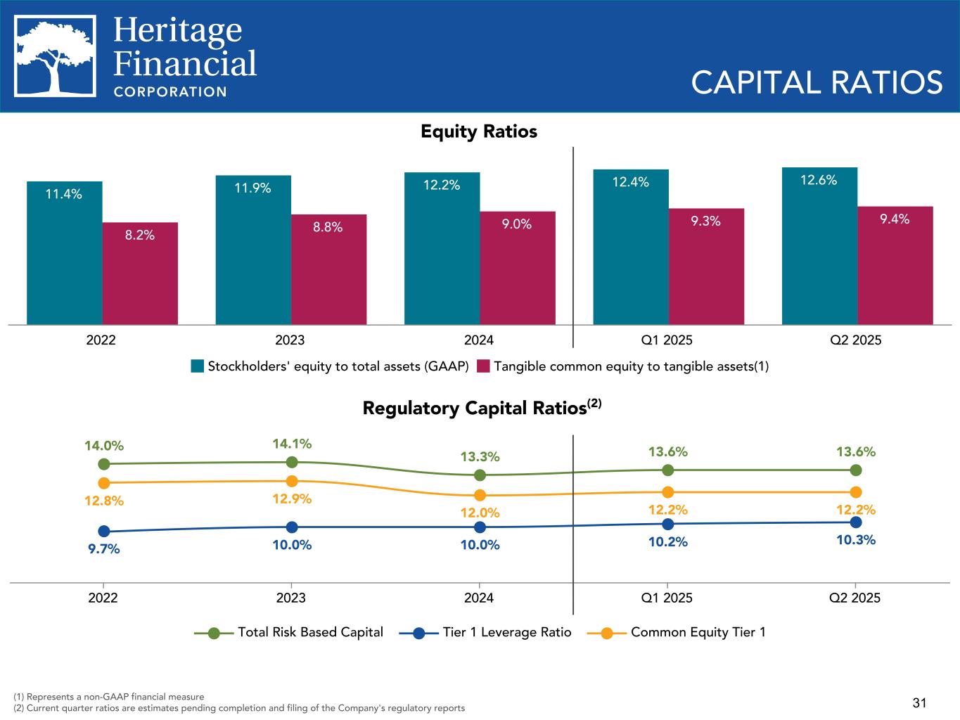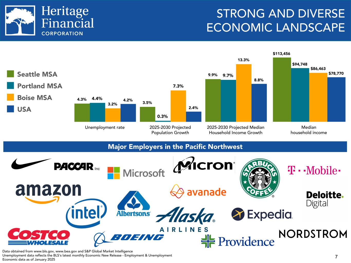 2本演示文稿包含1995年《私人证券诉讼改革法案》含义内的“前瞻性陈述”。此类陈述通常包括诸如“相信”、“预期”、“预期”、“估计”、“预测”、“打算”、“计划”、“目标”、“潜在”、“可能”、“项目”、“展望”或类似表达方式或未来或条件动词,如“可能”、“将”、“应该”、“将”和“可以”等词语,以及此类词语的否定。前瞻性陈述不是历史事实,而是代表管理层当前对未来事件的预期和预测,其中许多事件本质上是不确定的,超出了我们的控制范围。实际结果可能与这些前瞻性陈述中目前预期或预测的结果存在重大差异。可能导致我们的实际结果与前瞻性陈述中描述的结果存在重大差异的因素包括但不限于:•对国家或我们当地市场区域的经济状况、Heritage Financial Corporation(“公司”)存在借贷关系的其他市场或公司业务运营或金融市场其他方面的潜在不利影响,包括但不限于由于信贷质量恶化、房地产市场价值显着和持续降低、就业水平、劳动力短缺和潜在的衰退或经济增长放缓;•利率环境的变化,这可能会对我们的收入和支出、资产和债务的价值以及资本和流动性的可用性和成本产生不利影响;•通货膨胀的水平和影响以及联邦储备系统理事会应对这些变化的当前和未来货币政策;•对我们的业务产生不利影响的立法或监管变化,包括监管政策和原则方面的银行、证券和税法的变化,或此类规则和法规的解释和优先排序;•现有政策和行政命令,包括关税、移民政策、监管和其他政府机构、DEI和ESG倡议、消费者保护、外交政策和税收法规,受到威胁或实施或发生变化,对美国经济产生影响;•与公司业务、客户、借款、还款、投资和存款实践相关的信用和利率风险;•存款和存款集中度的波动;•流动性问题,包括我们借入资金或筹集额外资金的能力,如有必要;•我们投资证券价值的波动;•信贷风险和来自我们贷款组合中集中度(按地理区域类型、抵押品和行业)的风险;•中断、安全漏洞、内部欺诈、网络安全事件或其他不良事件,我们的信息技术系统或对为我们的业务执行关键处理功能的第三方供应商的故障或中断或攻击,包括使用人工智能和类似工具进行的复杂攻击;•我们和其他方(包括第三方供应商)实施的技术变革,这可能比预期的更难实施或成本更高,或可能对我们和我们的客户产生不可预见的后果,包括开发和实施包含人工智能的工具;•金融服务行业中来自信用合作社和金融科技公司等非银行的竞争加剧,包括数字资产服务提供商;•我们成功适应技术变化以在市场上有效竞争的能力,包括来自其他商业银行、抵押银行公司、信用合作社、证券经纪公司、保险公司的竞争,和金融科技公司;•关键会计政策和判断的影响,包括在确定我们某些资产的公允价值时使用估计,这些估计可能被证明是不正确的,并导致估值大幅下降;•针对我们或公司可能受到的诉讼和其他法律诉讼和监管行动的开始、成本、影响和结果;•关键人员的流失或无法吸引;•气候变化、恶劣天气事件、自然灾害、流行病、流行病和其他公共卫生危机、战争或恐怖主义行为的影响, 和其他外部事件对我们的业务和我们客户的业务的影响;•银行倒闭或其他银行的不利发展以及有关银行业的总体负面宣传对投资者和储户关于银行稳定性和流动性的情绪的影响;•我们成功地管理和应对了上述项目所涉及的风险。您还应考虑我们截至2024年12月31日止年度的10-K表格年度报告中“风险因素”部分所述的风险、假设和不确定性,以及我们向美国证券交易委员会(“SEC”)提交或提供的其他报告中所述的风险、假设和不确定性,这些报告可在我们的网站www.hf-wa.com和SEC的网站www.sec.gov上查阅。在评估任何前瞻性陈述时应考虑这些风险、假设和不确定性,不应过分依赖此类陈述。任何前瞻性陈述仅在作出之日发表,公司不承担更新任何前瞻性陈述的义务,无论是否反映作出陈述之日之后的事件或情况,以反映新信息或意外事件的发生,或以其他方式。除另有说明外,本演示文稿截至2025年6月30日。在任何情况下,本演示文稿的交付不会产生任何暗示,表明在该日期之后公司的事务没有任何变化。此处包含的某些信息可能来自行业来源提供的信息。我们认为,这些信息是准确的,获得信息的来源是可靠的。然而,我们无法保证此类信息的准确性,我们也没有对此类信息进行独立核实。非美国通用会计准则财务信息公司根据美国公认会计原则(“GAAP”)报告业绩。然而,管理层认为,在管理业务时使用的某些非公认会计准则绩效衡量标准可能会提供有关其业务基本趋势的有意义的信息。非GAAP财务指标应被视为公司根据GAAP编制的报告业绩的补充,而不是替代。包含非GAAP财务指标的讨论和调节的幻灯片包含在附录-非GAAP财务指标和季度财务统计的调节中。除非另有说明,否则整个演示文稿中显示的所有美元金额均以百万为单位,每股金额除外。由于四舍五入,列报的百分比总和可能不是100%。除非另有说明,所有表格和图表截至2025年6月30日。前瞻性陈述