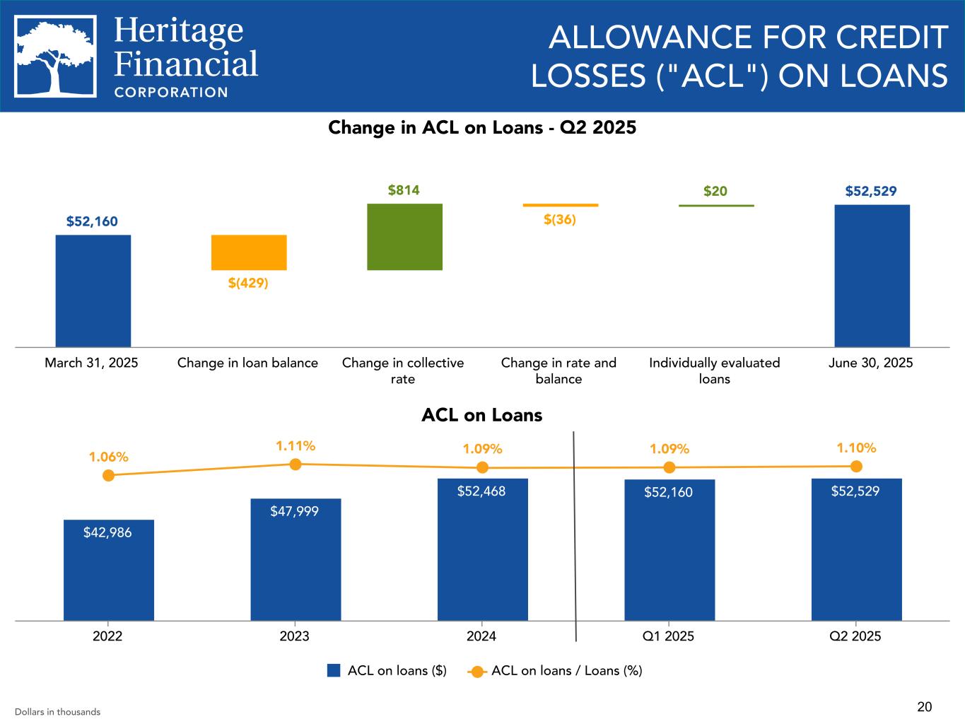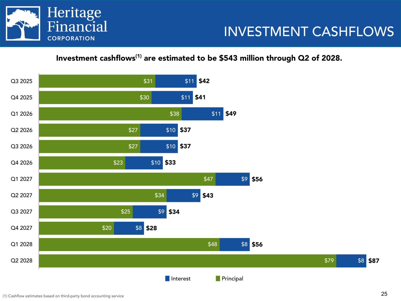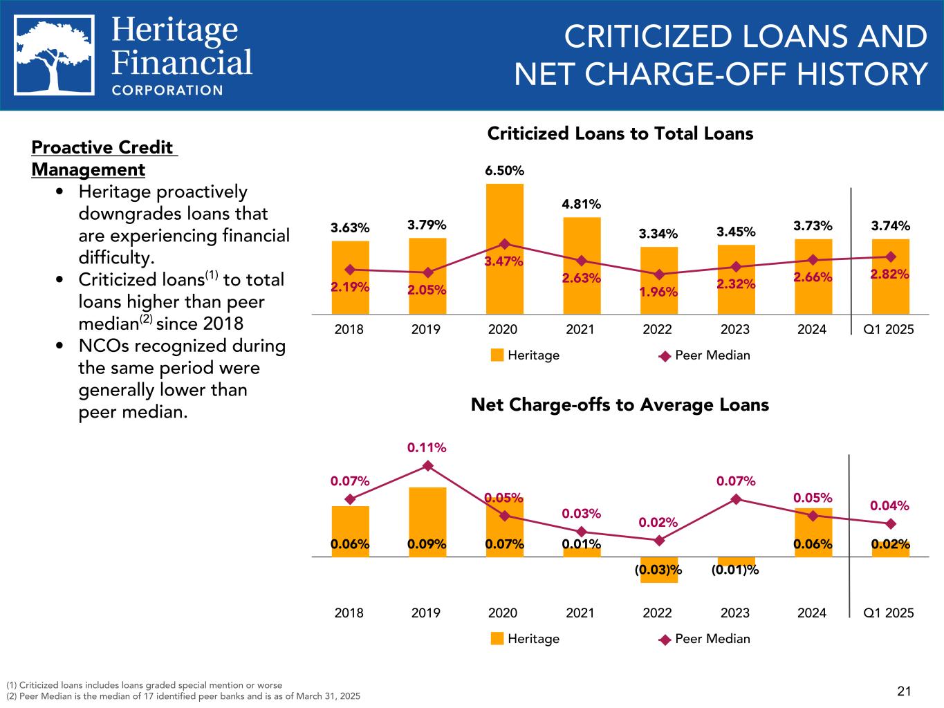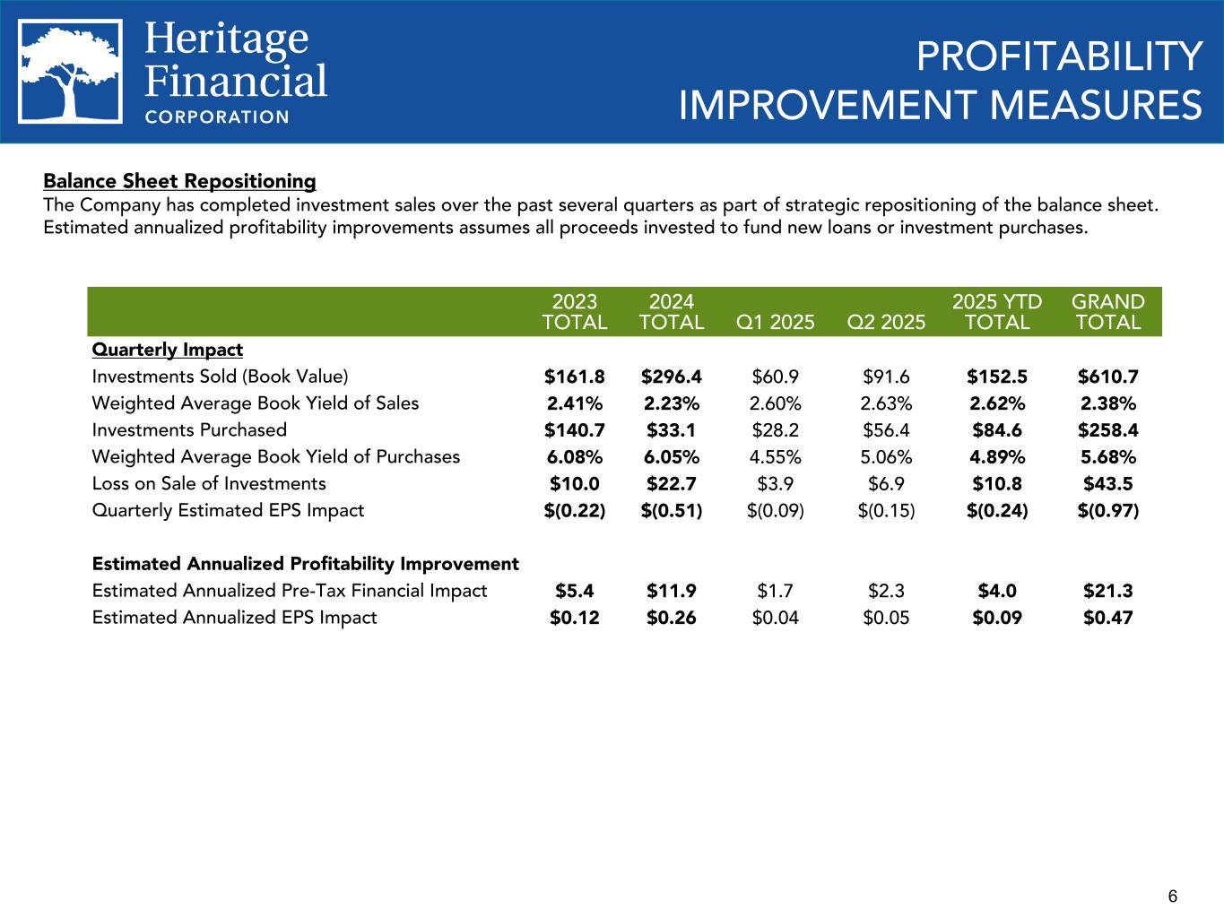 2本演示文稿包含1995年《私人证券诉讼改革法案》含义内的“前瞻性陈述”。此类陈述通常包括诸如“相信”、“预期”、“预期”、“估计”、“预测”、“打算”、“计划”、“目标”、“潜在”、“可能”、“项目”、“展望”或类似表达方式或未来或条件动词,如“可能”、“将”、“应该”、“将”和“可以”等词语,以及此类词语的否定。前瞻性陈述不是历史事实,而是代表管理层当前对未来事件的预期和预测,其中许多事件本质上是不确定的,超出了我们的控制范围。实际结果可能与这些前瞻性陈述中目前预期或预测的结果存在重大差异。可能导致我们的实际结果与前瞻性陈述中描述的结果存在重大差异的因素包括但不限于:•对国家或我们当地市场区域的经济状况、Heritage Financial Corporation(“公司”)存在借贷关系的其他市场或公司业务运营或金融市场其他方面的潜在不利影响,包括但不限于由于信贷质量恶化、房地产市场价值显着和持续降低、就业水平、劳动力短缺和潜在的衰退或经济增长放缓;•利率环境的变化,这可能会对我们的收入和支出、资产和债务的价值以及资本和流动性的可用性和成本产生不利影响;•通货膨胀的水平和影响以及联邦储备系统理事会应对这些变化的当前和未来货币政策;•对我们的业务产生不利影响的立法或监管变化,包括监管政策和原则方面的银行、证券和税法的变化,或此类规则和法规的解释和优先排序;•现有政策和行政命令,包括关税、移民政策、监管和其他政府机构、DEI和ESG倡议、消费者保护、外交政策和税收法规,受到威胁或实施或发生变化,对美国经济产生影响;•与公司业务、客户、借款、还款、投资和存款实践相关的信用和利率风险;•存款和存款集中度的波动;•流动性问题,包括我们借入资金或筹集额外资金的能力,如有必要;•我们投资证券价值的波动;•信贷风险和来自我们贷款组合中集中度(按地理区域类型、抵押品和行业)的风险;•中断、安全漏洞、内部欺诈、网络安全事件或其他不良事件,我们的信息技术系统或对为我们的业务执行关键处理功能的第三方供应商的故障或中断或攻击,包括使用人工智能和类似工具进行的复杂攻击;•我们和其他方(包括第三方供应商)实施的技术变革,这可能比预期的更难实施或成本更高,或可能对我们和我们的客户产生不可预见的后果,包括开发和实施包含人工智能的工具;•金融服务行业中来自信用合作社和金融科技公司等非银行的竞争加剧,包括数字资产服务提供商;•我们成功适应技术变化以在市场上有效竞争的能力,包括来自其他商业银行、抵押银行公司、信用合作社、证券经纪公司、保险公司的竞争,和金融科技公司;•关键会计政策和判断的影响,包括在确定我们某些资产的公允价值时使用估计,这些估计可能被证明是不正确的,并导致估值大幅下降;•针对我们或公司可能受到的诉讼和其他法律诉讼和监管行动的开始、成本、影响和结果;•关键人员的流失或无法吸引;•气候变化、恶劣天气事件、自然灾害、流行病、流行病和其他公共卫生危机、战争或恐怖主义行为的影响, 和其他外部事件对我们的业务和我们客户的业务的影响;•银行倒闭或其他银行的不利发展以及有关银行业的总体负面宣传对投资者和储户关于银行稳定性和流动性的情绪的影响;•我们成功地管理和应对了上述项目所涉及的风险。您还应考虑我们截至2024年12月31日止年度的10-K表格年度报告中“风险因素”部分所述的风险、假设和不确定性,以及我们向美国证券交易委员会(“SEC”)提交或提供的其他报告中所述的风险、假设和不确定性,这些报告可在我们的网站www.hf-wa.com和SEC的网站www.sec.gov上查阅。在评估任何前瞻性陈述时应考虑这些风险、假设和不确定性,不应过分依赖此类陈述。任何前瞻性陈述仅在作出之日发表,公司不承担更新任何前瞻性陈述的义务,无论是否反映作出陈述之日之后的事件或情况,以反映新信息或意外事件的发生,或以其他方式。除另有说明外,本演示文稿截至2025年6月30日。在任何情况下,本演示文稿的交付不会产生任何暗示,表明在该日期之后公司的事务没有任何变化。此处包含的某些信息可能来自行业来源提供的信息。我们认为,这些信息是准确的,获得信息的来源是可靠的。然而,我们无法保证此类信息的准确性,我们也没有对此类信息进行独立核实。非美国通用会计准则财务信息公司根据美国公认会计原则(“GAAP”)报告业绩。然而,管理层认为,在管理业务时使用的某些非公认会计准则绩效衡量标准可能会提供有关其业务基本趋势的有意义的信息。非GAAP财务指标应被视为公司根据GAAP编制的报告业绩的补充,而不是替代。包含非GAAP财务指标的讨论和调节的幻灯片包含在附录-非GAAP财务指标和季度财务统计的调节中。除非另有说明,否则整个演示文稿中显示的所有美元金额均以百万为单位,每股金额除外。由于四舍五入,列报的百分比总和可能不是100%。除非另有说明,所有表格和图表截至2025年6月30日。前瞻性陈述