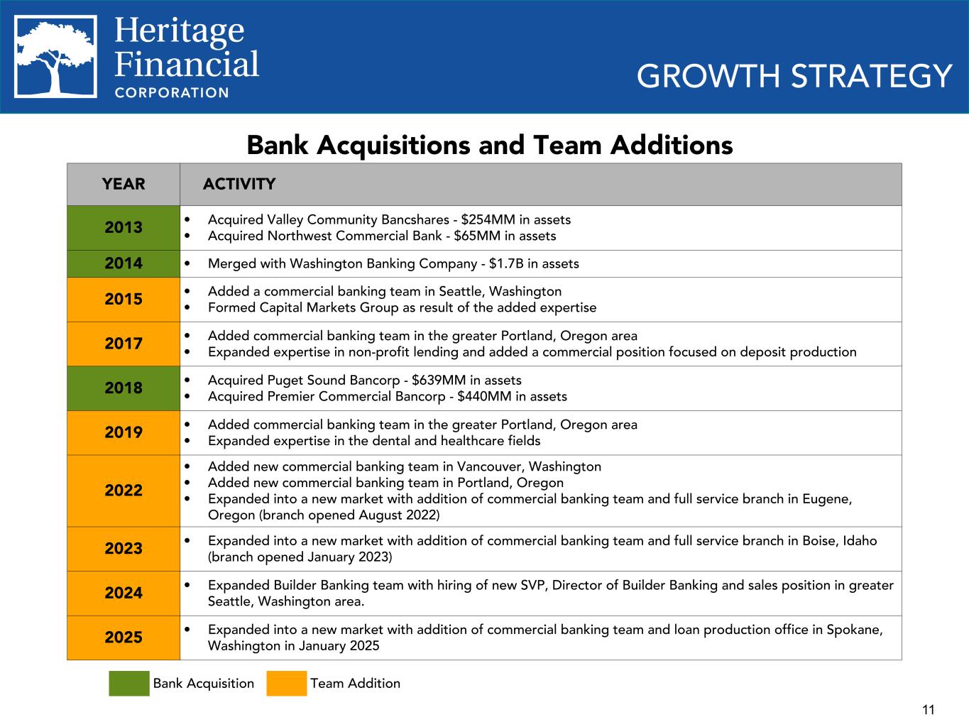 2013年11增长战略年活动•收购Valley Community Bancshares-资产2.54亿美元•收购Northwest Commercial Bank-资产6500万美元2014 •与华盛顿银行合并-资产1.7B美元2015 •在华盛顿州西雅图增加了一个商业银行团队•由于2017年增加了专业知识,组建了Capital Markets Group •在大波特兰增加了商业银行团队,俄勒冈地区•扩大了非营利贷款方面的专业知识,并增加了一个专注于存款生产的商业职位2018年•收购Puget Sound Bancorp-资产6.39亿美元•收购Premier Commercial Bancorp-资产4.40亿美元2019年•在俄勒冈州大波特兰地区增加了商业银行团队•扩大了牙科和医疗保健领域的专业知识2022年•在华盛顿州温哥华增加了新的商业银行团队•在俄勒冈州波特兰增加了新的商业银行团队•在尤金增加了商业银行团队和全方位服务分支机构,俄勒冈州(分行于2022年8月开业)2023 •通过在爱达荷州博伊西增设商业银行团队和全方位服务分行(分行于2023年1月开业)2024 •扩大了Builder Banking团队,在华盛顿州大西雅图地区招聘了新的高级副总裁、Builder Banking总监和销售职位。2025 •扩展到一个新市场,于2025年1月在华盛顿州斯波坎增加商业银行团队和贷款生产办公室银行收购和团队增加银行收购团队增加