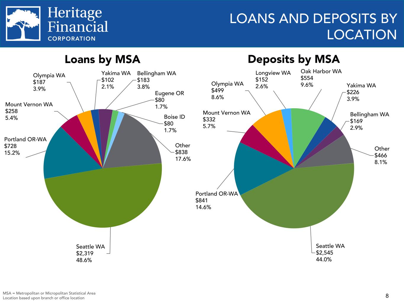 8笔按地点分列的贷款和存款MSA =基于分支机构或办公地点的大都市或小城市统计区域位置Seattle WA的贷款2,31948.6% Portland OR-WA $ 72815.2% Mount Vernon WA $ 2585.4% Olympia WA $ 1873.9% Yakima WA $ 1022.1% Bellingham WA $ 1833.8% Eugene或$ 801.7% Boise ID $ 801.7% Other $ 83817.6% Deposits by MSA Seattle WA $ 2,54544.0% Portland OR-WA $ 84114.6% Mount Vernon WA $ 3325.7% Olympia WA $ 4998.6% Longview WA $ 1522.6% Oak Harbor WA $ 5549.6% Yakima WA $ 2263.9% Bellingham WA $ 1692.9% O