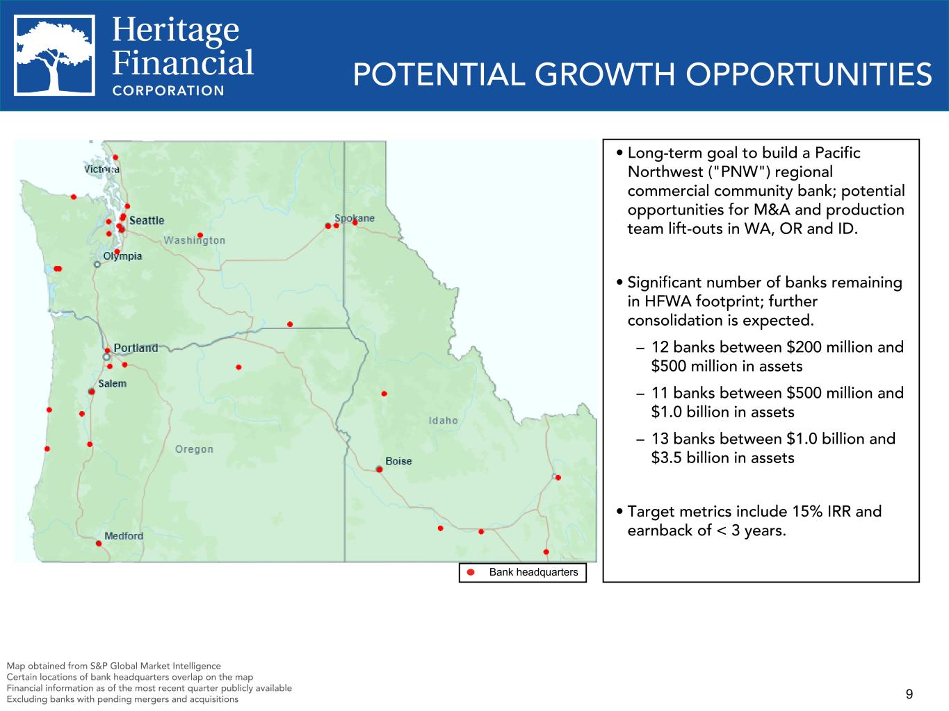 从标普全球市场情报中获得的9个潜在增长机会地图银行总部的某些位置在地图上有重叠截至已公开的最近一个季度的财务信息,不包括有未决并购的银行•建立太平洋西北地区(“PNW”)区域商业社区银行的长期目标;西澳或ID的并购和生产团队提升的潜在机会。•大量银行仍留在HFWA足迹;预计将进一步整合。– 12家银行资产在2亿至5亿美元之间– 11家银行资产在5亿至10亿美元之间– 13家银行资产在10亿至35亿美元之间•目标指标包括15%的内部收益率和< 3年的收益。银行总部