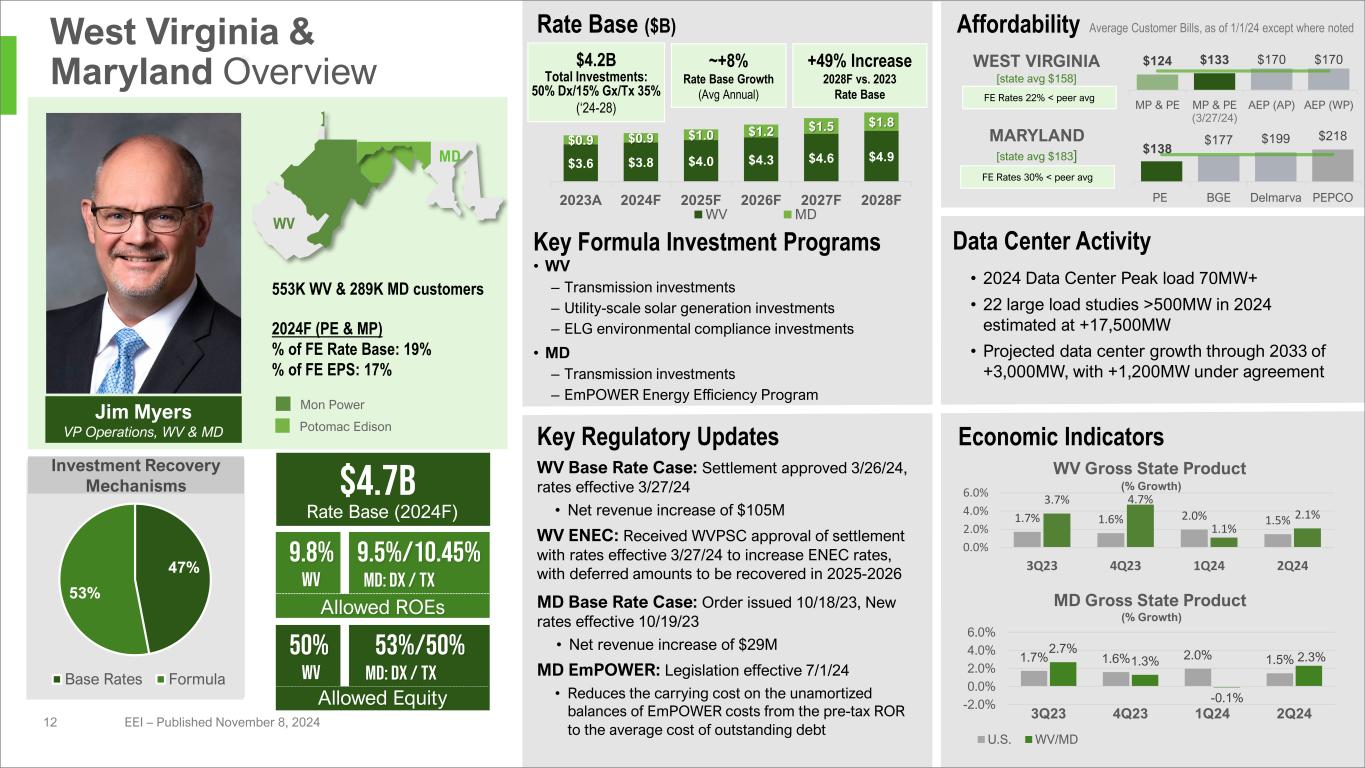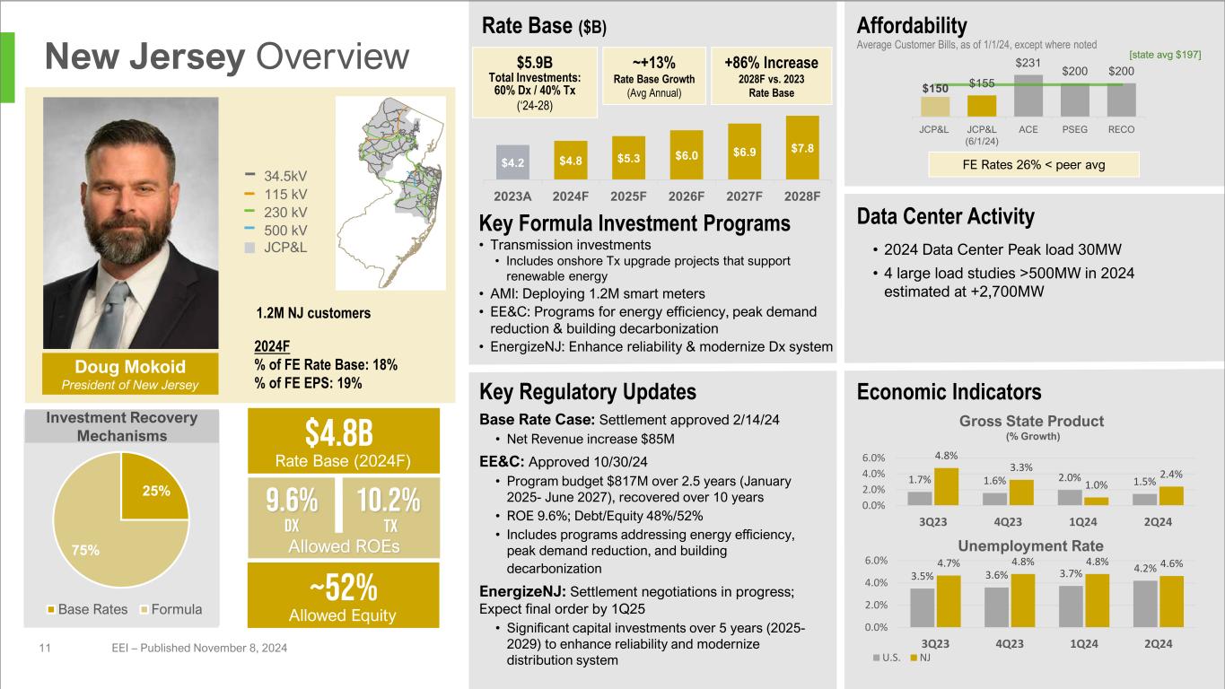 Doug Mokoid新泽西州总裁25% 75%基本费率公式34.5kV 115 kV 230 kV 500 kV JCP & L 2024F % FE费率基数:18%% FE EPS:19%新泽西州概览EEI – 202411年11月8日发布Rate Base($ B)关键监管更新Base Rate Case:和解获得批准2/14/24 •净收入增加8500万美元EE & C:获得批准10/30/24 •计划预算在2.5年(2025年1月至2027年6月)内为8.17亿美元,在10年内恢复• ROE9.6 %;债务/股权48%/52% •包括解决能源效率、峰值需求减少、和建筑脱碳EnergizeNJ:和解谈判正在进行中;预计到25年第一季度获得最终订单• 5年内(2025-2029年)的重大资本投资,以提高可靠性和使配电系统经济指标现代化关键公式投资计划•输电投资•包括支持可再生能源的陆上TX升级项目• AMI:部署120万智能电表• EE & C:能源效率计划,峰值需求减少&建筑脱碳• EnergizeNJ:增强可靠性和现代化DX系统$ 5.9B总投资:60% DX/40% TX(‘24-28)~+ 13%利率基数增长(平均每年)+ 46% 2028F vs. 2023 $ 150 $ 155 $ 231 $ 200 $ 200 JCP & L JCP & L(6/1/24)ACE PSEG RECO FE利率26% < peer avg [ state avg $ 197 ]投资回收机制1.7% 1.6% 2.0% 1.5% 4.8% 3.3% 1.0% 2.4% 0.0% 2.0% 4.0% 6.0% 3Q23 4Q23 1Q24 2Q24州生产总值(%增长)3.5% 3.6% 3.7% 4.2% 4.7% 4.8% 4.8% 4.6% 0.0% 2.0% 4.0% 6.0% 3Q23 4Q23费率基数(2024F)~52%允许权益数据中心活动$ 4.2 $ 4.8 $ 5.3 $ 6.0 $ 6.9 $ 7.8 2023A 2024F 2025F 2026F 2027F 2028F可负担性平均客户账单,截至1/1/24,除非另有说明,2028F与2023费率基数相比增加+ 86% • 2024年数据中心峰值负载30MW • 2024年4个大负载研究> 500MW估计+ 2700MW 9.6% 10.2% DX TX允许ROE