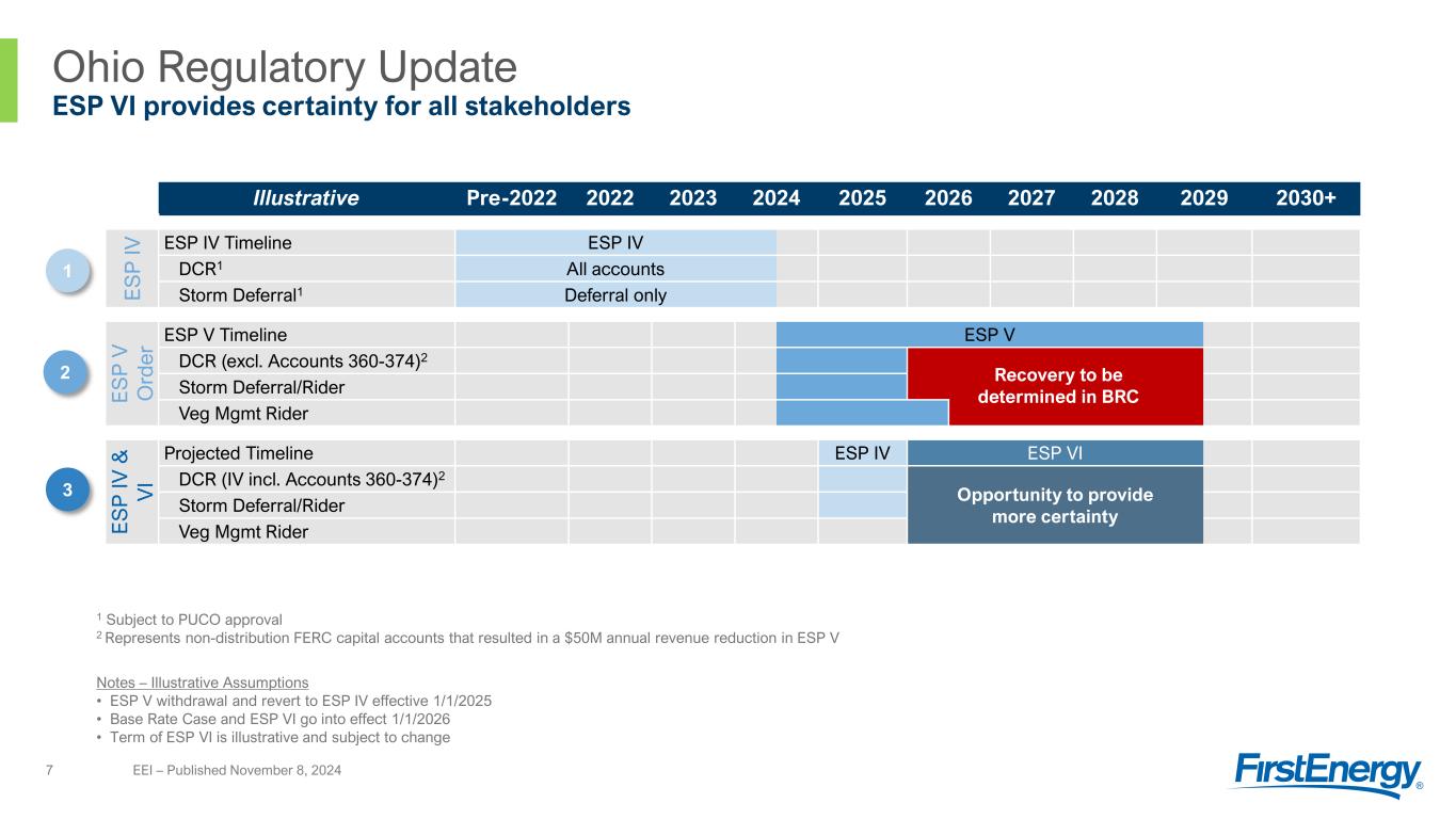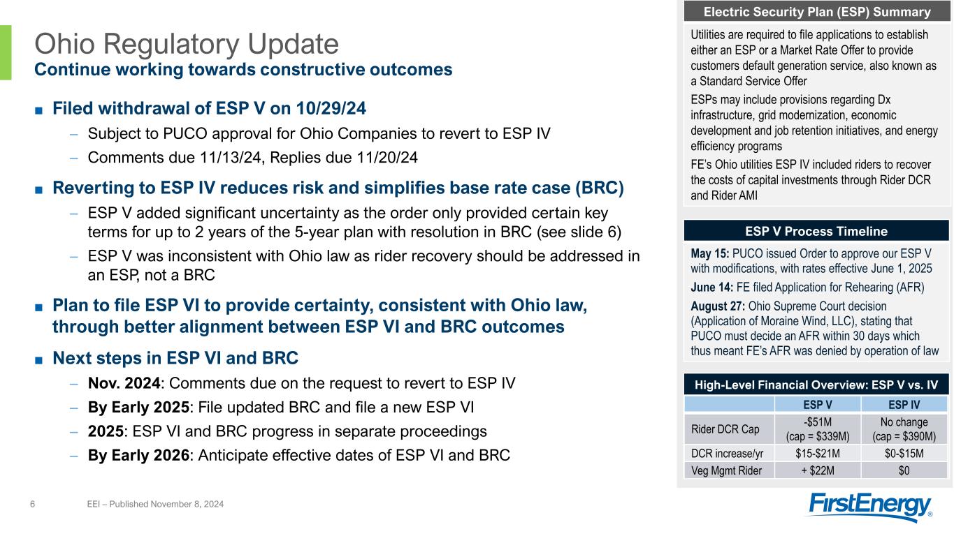 俄亥俄州监管更新继续努力取得建设性成果■于10/29/24提交撤回ESP V –须经PUCO批准俄亥俄州公司恢复ESP IV –评论到期11/13/24,回复到期11/20/24 ■恢复ESP IV可降低风险并简化基准费率案例(BRC)– ESP V增加了重大的不确定性,因为该命令仅提供了5年计划中最多2年的某些关键条款,决议在BRC(见幻灯片6)– ESP V不符合俄亥俄州法律,因为应在ESP中处理骑手恢复问题,不是BRC ■计划提交ESP VI以提供确定性,符合俄亥俄州法律,通过更好地使ESP VI和BRC结果保持一致■ ESP VI和BRC EEI的下一步行动– 2024年11月:对恢复ESP IV请求的到期评论–到2025年初:提交更新的BRC并提交新的ESP VI – 2025年:在单独的程序中提交ESP VI和BRC进展–到2026年初:预计ESP VI和TERM5 EEI的生效日期– 11月8日发布,20246 ESP V进程时间表5月15日:PUCO发布命令,批准我们的ESP V进行修改,费率自2025年6月1日起生效6月14日:FE提交了重新审理申请(AFR)8月27日:俄亥俄州最高法院裁决(Moraine Wind,LLC的申请),指出PUCO必须在30天内决定AFR,这意味着FE的AFR被法律操作拒绝电力安全计划(ESP)汇总公用事业公司必须提交申请,以建立ESP或市场利率报价,以向客户提供默认生成服务,也称为标准服务提供ESP可能包括有关DX基础设施、电网现代化、经济发展和工作保留倡议的条款,能源效率计划FE的俄亥俄州公用事业ESP IV包括骑手通过Rider DCR和Rider AMI收回资本投资成本的高级别财务概览:ESP V与IV ESP V ESP IV Rider DCR上限-5100万美元(cap = 3.39亿美元)没有变化(cap = 3.9亿美元)DCR增加/年15-21万美元0-1500万美元Veg MGMT Rider + 2200万美元0美元