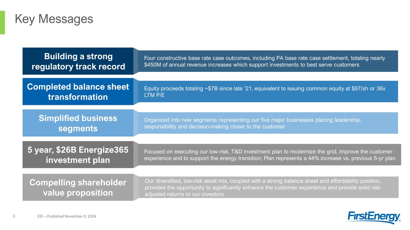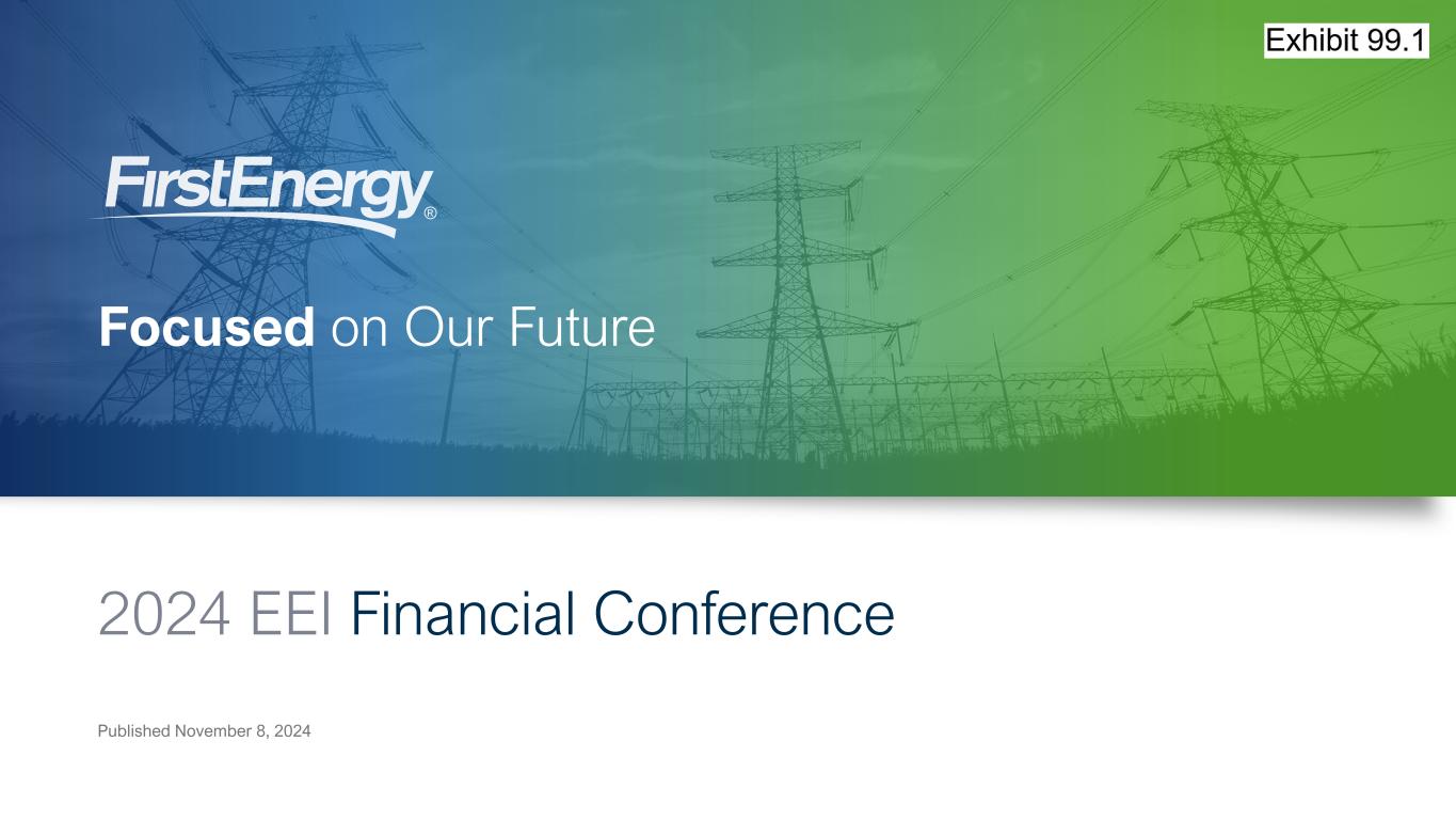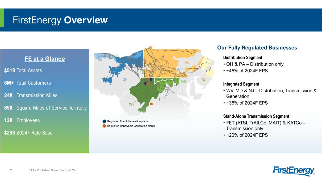 EEI – 20242年11月8日发布FirstEnergy概览$ 51B总资产600万+总客户24k传输英里65k平方英里服务区域12k员工$ 29B 2024F费率基础分配部分• OH & PA –仅分配•~45%的2024F EPS集成部分• WV、MD & NJ –分配、传输和发电•~35%的2024F EPS独立传输部分• FET(ATSI、TraILCo、MAIT)& KATCo –仅传输•~20%的2024F EPS FE一览我们完全监管的业务监管化石发电站监管可再生发电站