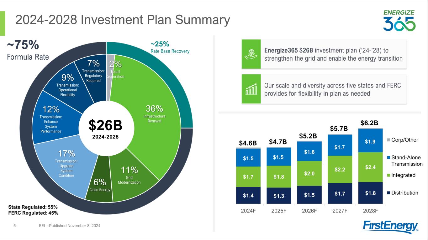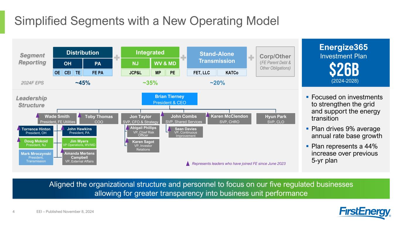 Brian Tierney总裁兼首席执行官Wade Smith总裁、FE Utilities Torrence Hinton总裁、OH John Hawkins总裁、PA Doug Mokoid总裁、NJ Jim Myers运营副总裁、WV/MD Mark Mroczynski总裁、传输Amanda Mertens Campbell副总裁、对外事务Toby Thomas首席运营官Jon Taylor高级副总裁、首席财务官兼战略Abigail Phillips副总裁、首席风险官Karen Sagot副总裁、投资者关系John Combs高级副总裁、共享服务Sean Davies副总裁、持续改进Karen McClendon高级副总裁、CHRO Hyun Park高级副总裁,CLO简化了采用新运营模式的细分市场4 Stand-alone Transmission Distribution Integrated Corp/Other(FE母公司债务和其他义务)PAOH CEIOE TE FE PA WV & MDNJ JCP & L PEMP FET,LLC KATCo代表自2023年6月以来加入FE的领导者$ 26B Energize365投资计划(2024-2028)专注于投资以加强电网和支持能源转型计划推动9%的年均基数增长计划比之前的5年计划增长44%调整组织结构和人员,以专注于我们的五项受监管业务,从而使业务单位绩效分部报告领导层的透明度更高Structure~45%~35%~20% EEI – 2024年11月8日发布2024F EPS