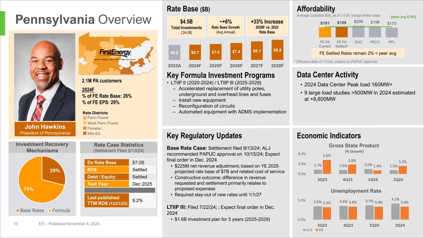 宾夕法尼亚州概览EEI – 202410年11月8日发布Rate Base($ B)关键监管更新Base Rate Case:Settlement filed 9/13/24;ALJ recommended PAPUC approval on 10/15/24;expect final order in December 2024 • $ 2.25亿净收入调整,基于YE2025年预计7B美元的费率基数和相关服务成本•建设性成果;请求和结算的收入差异主要与拟议费用有关•要求在1/1/27之前不采用新费率LTIIP III:提交7/22/24;;预计2024年12月获得最终订单• 5年(2025-2029)经济指标的1.6B美元投资计划关键公式投资方案• LTIIP II(2020-2024)/LTIIP III(2025-2029)——加速更换电线杆,地下和架空线路和保险丝——安装新设备——重新配置电路——采用ADMS实施的自动化设备$ 4.5B总投资(' 24-28)~+ 6%利率基数增长(平均每年)+ 27% 2028F与2023年度相比John Hawkins宾夕法尼亚州总统29% 71%的基准利率公式Penna Power West Penna Power Penelec Met-Ed Rate Districts2024F % of FE Rate Base:26%% of FE EPS:29% $ 181 $ 189 $ 209 $ 198 $ 173 FE PA current FE PA settled*DUQ PECO PPL [ State avg $ 190 ] Investment Recovery Mechanisms Last Filed Rate Case Statistics 3.5% 3.6% 3.7% 4.2% 3.3% 3.4% 3.4% 3.4% 3.4% 0.0% 5.0% 3Q23 4Q23 1Q24 2Q24失业率美国PA Rte案例统计(结算提交9/13/24)Dx Rate Base $ 7.0B ROE已结算债务/股权结算测试年份2025年12月最后公布的TTM ROE(12/21/23)9.2% 210万PA客户$ 6.6 $ 6.7 $ 7.0 $ 7.4 $ 8.1 $ 8.8 2023A 2024F 2025F 2026F 2027F 2028F数据中心活动FE结算费率保持2% < peer avg*1/1/25生效,须经PAPCC批准2028F较2023费率基数增加+ 33% • 2024年数据中心峰值负荷160MW + •9个大型负荷研究> 2024年500MW估计+ 8800MW可负担性平均客户账单,截至1/1/24,除非另有说明1.7% 1.6% 2.0% 1.5% 5.6% 3.8% 1.4% 3.2% 0.0% 4.0% 8.0% 3Q23 4Q23 1Q24 2Q24州生产总值(增长百分比)