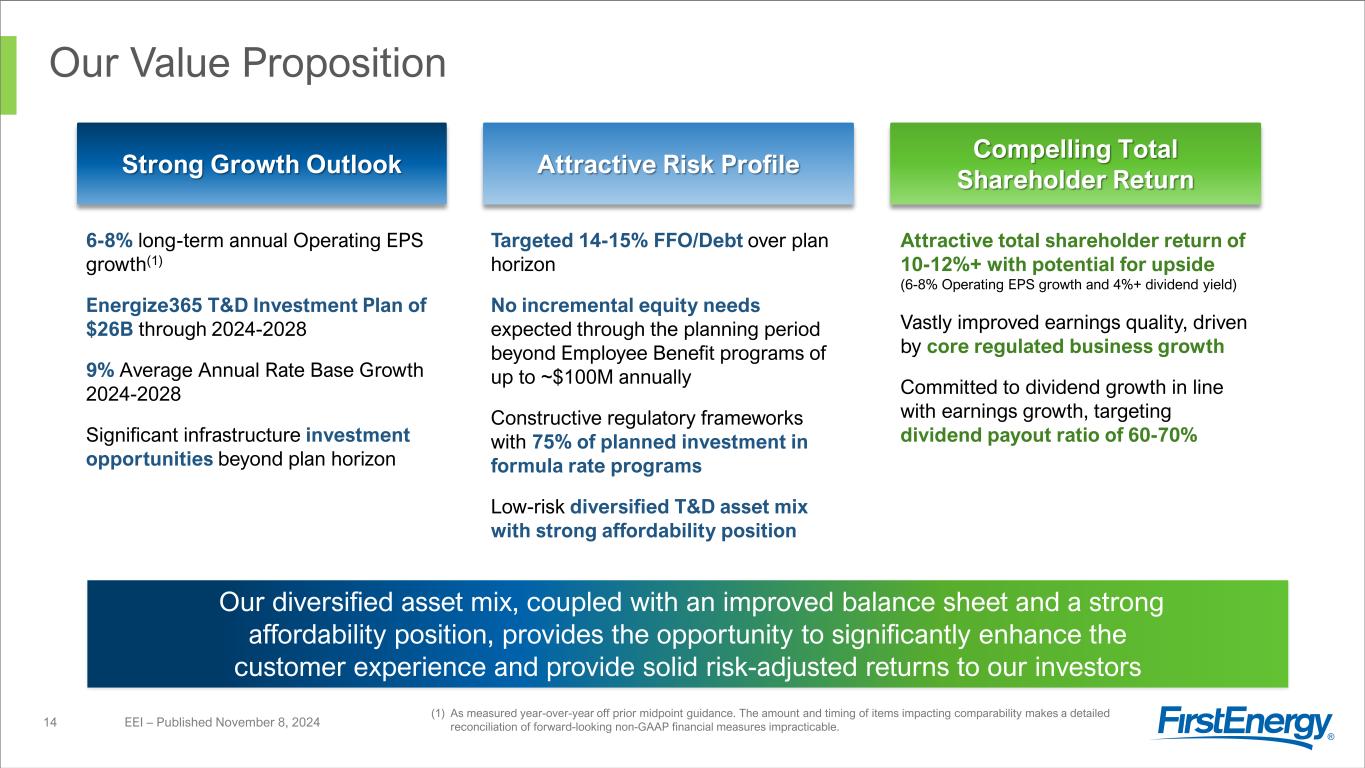 我们的价值主张14(1)同比衡量低于先前的中点指导。影响可比性的项目的数量和时间使得对前瞻性非GAAP财务指标进行详细调节变得不切实际。强劲的增长前景有吸引力的风险状况令人信服的股东总回报6-8 %的长期年运营EPS增长(1)Energize365 T & D投资计划到2024-2028年为26B美元9%的平均年费率基数基础增长2024-2028年计划范围以外的重要基础设施投资机会目标为14-15 %的FFO/债务超过计划范围预计在每年高达约1亿美元的员工福利计划之后的规划期内没有增量股权需求建设性的监管框架,计划投资的75%用于公式费率计划低风险的多元化T & D资产组合,具有较强的承受能力地位,具有10-12 % +的有吸引力的股东总回报率,具有上行潜力(6-8 %的运营EPS增长和4% +股息收益率)盈利质量大幅改善,受核心受监管业务增长推动致力于与盈利增长同步的股息增长,目标股息支付率为60-70 %我们多元化的资产组合,加上资产负债表改善和强大的负担能力地位,提供了显着提升客户体验的机会,并为我们的投资者提供了稳健的风险调整后回报EEI – 2024年11月8日发布