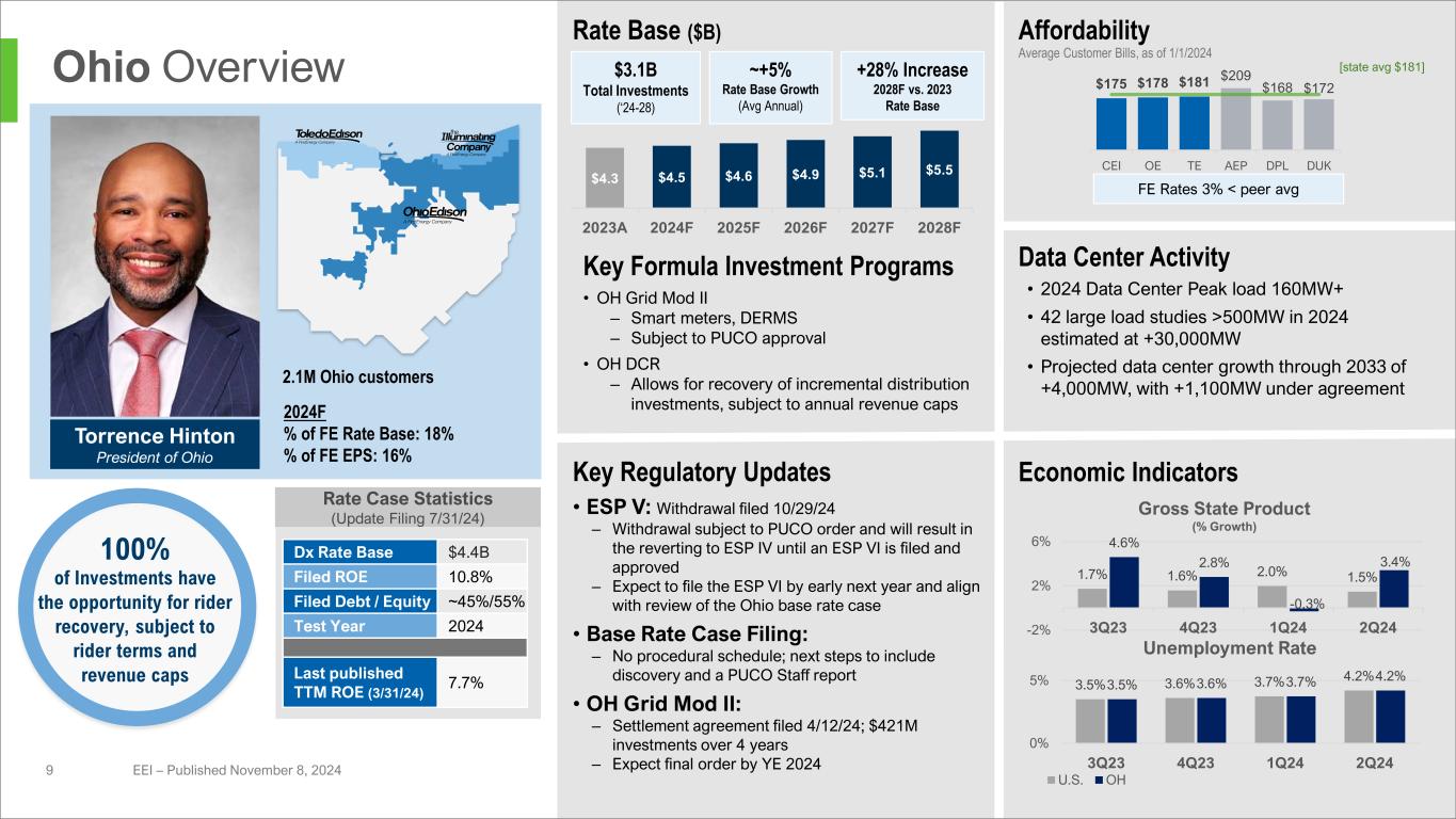 2024F % FE Rate Base:18%% FE EPS:16% Torrence Hinton Ohio Rate Case Statistics总裁(更新文件7/31/24)Dx Rate Base $ 4.4B Filed ROE10.8 % Filed Debt/Equity~45%/55% Test Year 2024 Last published TTM ROE(3/31/24)7.7% Ohio Overview EEI – published November 8,202491.7% 1.6% 2.0% 1.5% 4.6% 2.8%-0.3 % 3.4%-2 %2% 6% 3Q23 4Q23 1Q24 2Q24州生产总值(增长率)率基数($ B)关键监管更新• ESP V:根据PUCO命令提交的退出,将导致恢复到ESP IV,直到ESP VI被提交和批准——预计在明年初提交ESP VI,并与俄亥俄州基本利率案例的审查保持一致•基本利率案例提交:——没有程序性时间表;下一步包括发现和PUCO工作人员报告• OH Grid MOD II:——和解协议提交4/12/24;4年4.21亿美元投资——预计到2024年YE的最终订单为175美元178美元181美元209美元168美元172美元CEI OE TE DUK [州平均181美元] FE利率3% <同行平均3.5% 3.6% 3.7% 4.2% 3.5% 3.6% 3.7% 4.2% 0% 5% 3Q23 4Q23 1Q24 2Q24失业率美国OH数据中心活动经济指标关键公式投资计划• OH Grid MOD II ——智能电表,DERMS ——须经PUCO批准• OH DCR ——允许收回增量配电投资,但须遵守年度收入上限$ 3.1b总投资(' 24-28)~+ 5%费率基数增长(平均年度)+ 28% 2028F与2023年费率基数210万俄亥俄州客户相比增加28% • 2024年数据中心峰值负载160MW + • 42个大型负载研究在2024年> 500MW估计+ 30,000MW •预计到2033年数据中心增长+ 4,000MW,根据协议+ 1,100MW $ 4.3 $ 4.5 $ 4.6 $ 4.9 $ 5.1 $ 5.5 2023A 2024F 2025F 2026F 2027F 2028F可负担性平均客户账单,截至2024年1月1日,100%的投资有机会恢复骑手,但须遵守骑手条款和收入上限