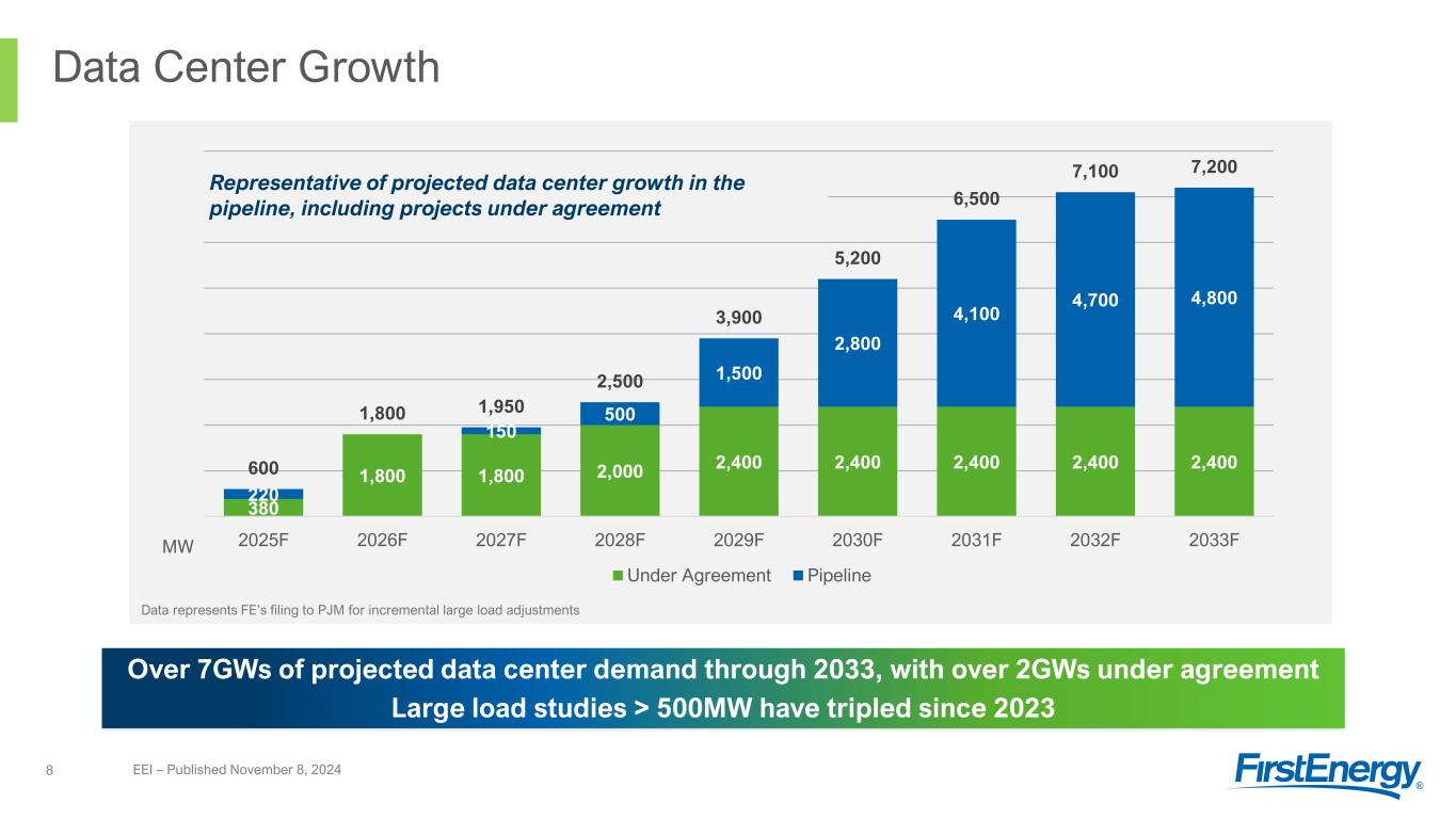 Data Center Growth EEI – Published November 8,202483801,8002,0002,4002,4002,4002,4002,4002,4002,4002,4002,4002,4002,42020 1505001,5002,8002,8004,4004,8006001,8001,9502,5003,9005,2006,5007,1007,200 2025F 2026F 2027F 2028F 2029F 2030F 2031F 2032F 2033F Under Agreement Pipeline MW Data Center load growth not included in FE'24-28 load forecast representative of projected data center growth in the pipeline,including proj有超过2GW的协议大负荷研究> 500MW自2023年以来增加了两倍数据代表FE向PJM提交的增量大负荷调整申请