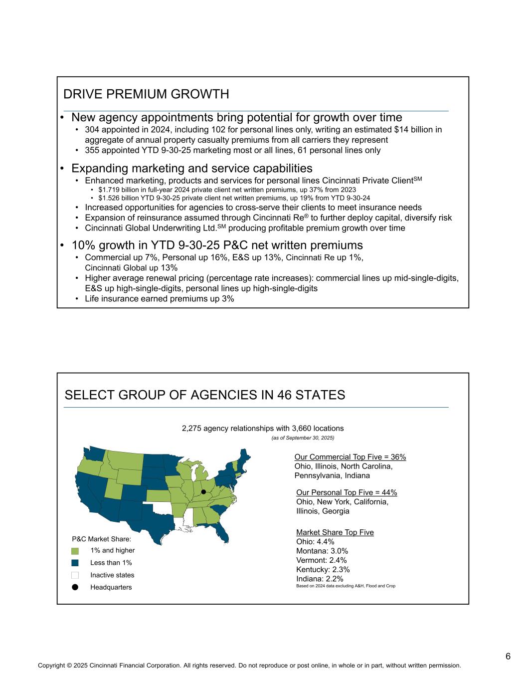 5版权©2025 辛辛那提金融公司。版权所有。未经书面许可,不得全部或部分转载或在网上发布。长期成功战略•为机构提供持续支持的资金实力•多样化的固定期限投资组合,阶梯式期限结构•在9-30-25时没有企业风险敞口超过总债券投资组合的0.6%,没有市政风险敞口超过0.2% •普通股投资组合的40.3%增加账面价值•没有单一证券超过公开交易普通股投资组合的7.7% •投资组合构成有助于减轻通胀和利率上升的预期影响•对债务的依赖程度较低,在9-30-25时债务与总资本之比为5.0% •不可转换,2028年和2034年到期的不可赎回债券•增长能力,溢价比盈余为1.0比1 •运营结构反映了以机构为中心的模式•外地重点——为当地决策配备人员,机构支持•卓越的理赔服务和广泛的保险产品供应•利润改善和保费增长举措管理保险盈利能力•持续的承保专业知识增强•预测建模工具和分析,以提高财产伤亡定价的精准度和在个别政策基础上的细分•数据管理,以更好地承保和更精细的定价决策•将专业化和增强联系起来,旨在降低赔付率•通过技术提高效率和易用性•简化机构的处理和公司•帮助优化个性化服务•为未来投资•通过费率充足性和风险选择/损失控制举措提高盈利能力•通过将业务扩展到新的地区和产品领域来分散风险•对费用率短期影响不大的战略投资•自2019年底以来,外地联营公司增长15%,支持健康的保费增长