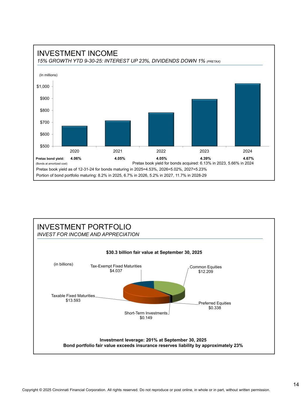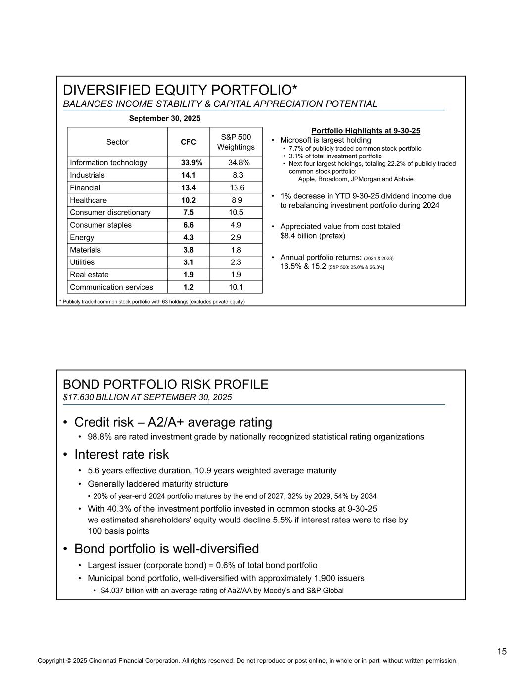 14版权©2025年辛辛那提金融公司。版权所有。未经书面许可,不得全部或部分转载或在网上发布。年初至今投资收入增长15% 9-30-25:利息上涨23%,股息下降1%(PRETAX)$ 500 $ 600 $ 700 $ 800 $ 900 $ 1,000202021202220232024(百万)税前债券收益率:4.06% 4.05% 4.05% 4.39% 4.67%(以摊余成本计价的债券)所购债券的税前账面收益率:2023年为6.13%,2024年为5.66%,2025年到期的债券截至12-31-24的税前账面收益率= 4.53%,2026年= 5.02%,2027年= 5.23%到期债券组合部分:2025年8.2%,2026年6.7%,2027年5.2%,11.7% 2028-29年投资组合投资收益和增值应税固定期限13.593美元免税固定期限4.037美元普通股12.209美元优先股0.338美元短期投资0.14 9美元投资杠杆:2025年9月30日201%债券投资组合公允价值超过保险准备金负债约23% 2025年9月30日公允价值303亿美元(十亿)
