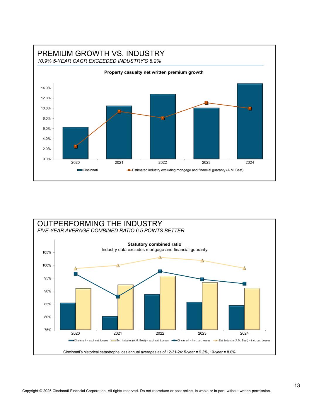 13版权©2025 辛辛那提金融公司。版权所有。未经书面许可,不得全部或部分转载或在网上发布。保费增长VS.行业10.9% 5年复合年增长率超过行业8.2% 0.0% 2.0% 4.0% 6.0% 8.0% 10.0% 12.0% 14.0% 20202021202220232024辛辛那提估计行业不包括抵押贷款和财务担保(A.M. Best)财产伤亡净承保保费增长超过行业五年平均综合比率6.5个点更好75% 80% 85% 90% 95% 100% 105% 20202021202220232024辛辛那提–不包括美国农业部预计亏损。工业(上午最佳)–不包括猫。损失Cincinnati – incl.cat.损失EST。工业(上午最佳)–包括猫。损失辛辛那提截至12-31-24的历史巨灾损失年平均值:5年= 9.2%,10年= 8.0%法定合并比率行业数据不包括抵押和财务担保