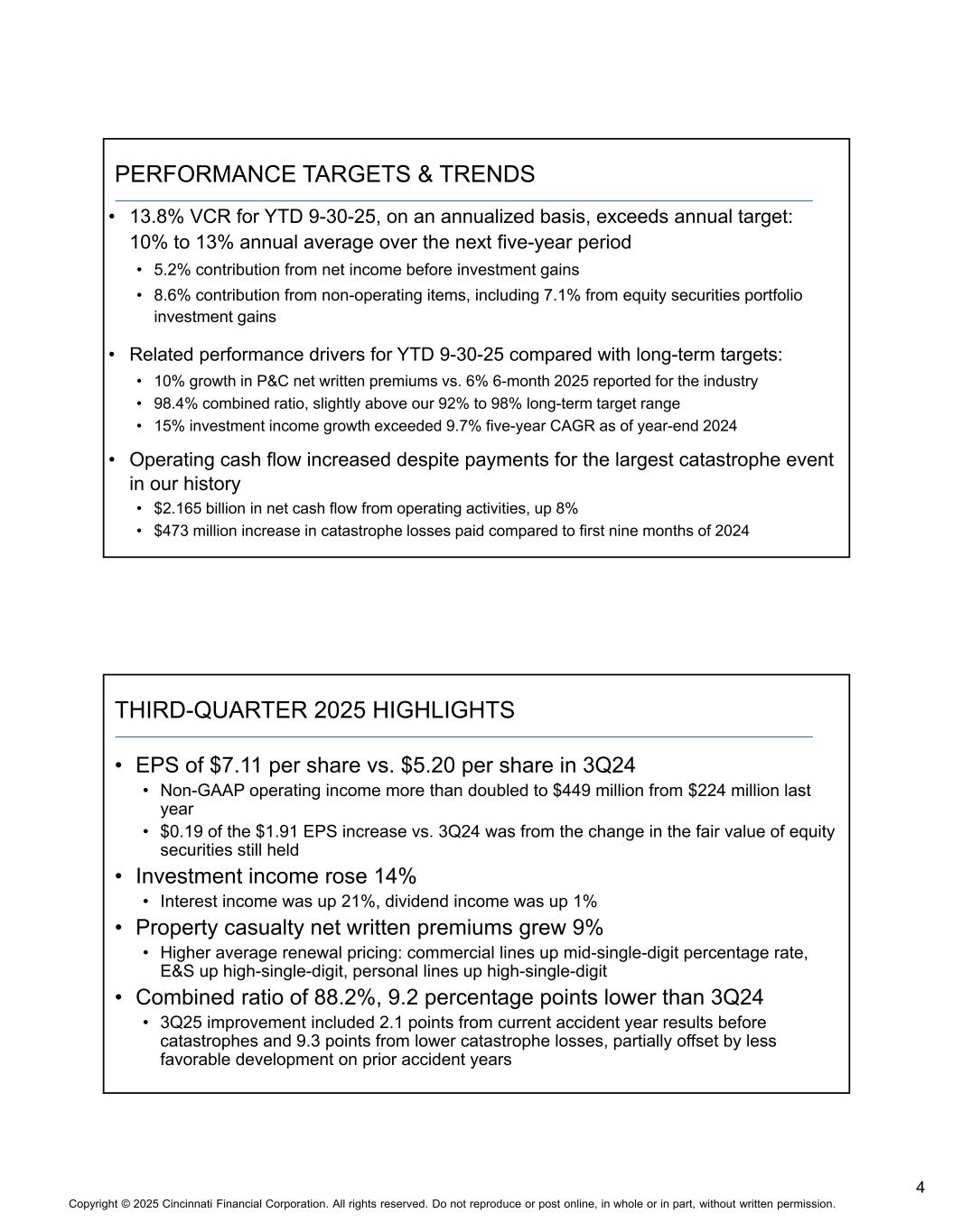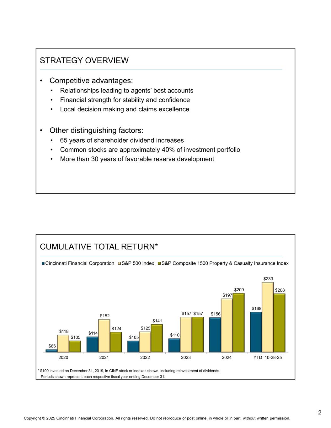 1版权©2025年辛辛那提金融公司。版权所有。未经书面许可,不得全部或部分转载或在网上发布。自1950年以来,投资者举办了一场通往更好的桥梁2025年11月NASDAQ:CINF本演示文稿包含涉及风险和不确定性的前瞻性陈述。请参阅我们向美国证券交易委员会提交的各种文件,了解可能导致结果与所讨论的结果存在重大差异的因素。本演示文稿中的前瞻性信息已公开披露,最近一次是在2025年10月27日,应被视为仅在该日期有效。将其列入本文件并不是为了更新或重申任何以后日期的前瞻性信息。非GAAP措施的调节在我们最近的季度收益新闻稿中,可在investors.cinfin.com上查阅。