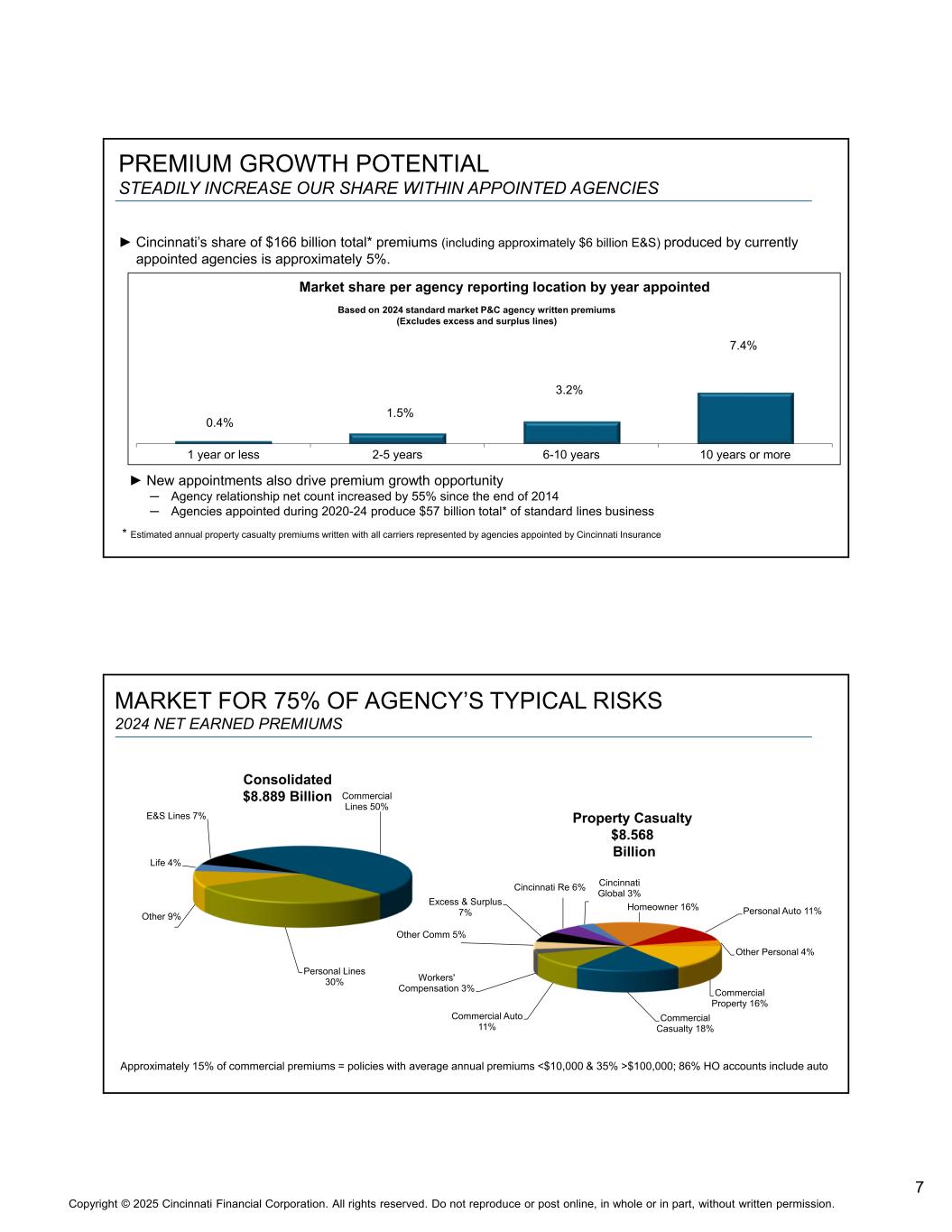 6版权©2025 辛辛那提金融公司。版权所有。未经书面许可,不得全部或部分转载或在网上发布。推动保费增长•新的代理任命随着时间的推移带来增长潜力• 2024年任命304名,其中102名仅针对个人险种,估计每年从他们所代表的所有运营商处获得的财产伤亡保费总额为140亿美元• 355名年初至今任命9-30-25营销大部分或全部险种,61名个人险种•扩大营销和服务能力•增强个人险种的营销、产品和服务Cincinnati Private ClientSM • 2024年全年私人客户净承保保费为17.19亿美元,较2023年增长37% • 15.26亿美元年初至今9-30-25私人客户净承保保费,较年初至今增长19% 9-30-24 •机构交叉服务客户以满足保险需求的机会增加•扩大通过辛辛那提再保险承担的再保险®进一步部署资本,分散风险• Cincinnati Global Underwriting Ltd.SM随着时间的推移产生可盈利的保费增长•年初至今10%的财险净承保保费增长9-30-25 •商业增长7%,个人增长16%,E & S增长13%,Cincinnati Re增长1%,Cincinnati Global增长13% •更高的平均续期定价(百分比费率增长):商业线路增长中个位数,E & S增长高个位数,个人排队高个位数•人寿保险已赚保费增长3% 46个州的精选代理组财产险市场份额:2275个代理关系,3660个地点我们的商业前五名= 36%俄亥俄州、伊利诺伊州、北卡罗来纳州、宾夕法尼亚州、印第安纳州我们的个人前五名= 44%俄亥俄州、纽约州、加利福尼亚州、伊利诺伊州、佐治亚州1%及更高不到1%的非活跃州总部(截至2025年9月30日)市场份额前五名俄亥俄州:4.4%蒙大拿州:3.0%佛蒙特州:2.4%肯塔基州:2.3%印第安纳州:2.2%基于2024年数据,不包括A & H、洪水和作物