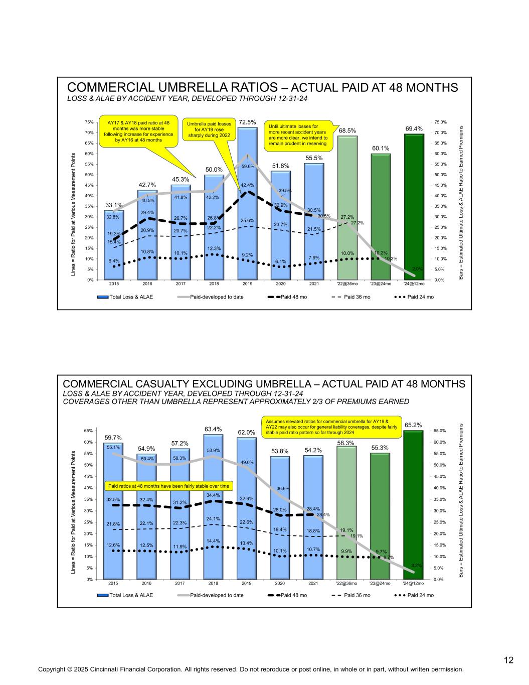 12版权所有©2025 辛辛那提金融公司。版权所有。未经书面许可,不得全部或部分转载或在网上发布。Commercial UmbRELLA RATIOS –按事故年份按48个月损失& ALAEE实际支付,通过12-31-24 L in e s = r a tio fo r p a id a t v a rio u s m e a su re m en t p o in ts b a rs = e st im a te d u lti m a te l o ss & a l a e r a tio to e a rn e d p re m iu m s 33.1% 42.7% 45.3% 50.0% 72.5% 51.8% 55.5% 68.5% 60.1% 69.4% 32.8% 40.5% 41.8% 42.2% 59.6% 39.5% 30.5% 27.2% 10.2% 2.0% 19.3% 29.4% 26.7% 26.8% 42.4% 32.9% 30.5%15.4% 20.9% 20.7% 22.2% 25.6% 23.7% 21.5% 27.2% 6.4% 10.8% 10.1% 12.3% 9.2% 6.1% 7.9% 10.0% 10.2% 0.0% 5.0% 10.0% 15.0% 20.0% 25.0% 30.0% 35.0% 40.0% 45.0% 50.0% 55.0% 60.0% 65.0% 70.0% 75.0% 5% 10% 15% 20% 25% 30% 35% 40% 45% 50% 55% 60% 65% 70% 75% 2015201620172018201920202021‘22 @ 36mo’23 @ 24mo'24 @ 12mo24 total loss & ALAEE paid-developed to date paid 48 mo paid 36 mo paid 24 mo AY17 & AY18 paid ratio at 48 months are more stable following increase根据AY16在48个月时的经验,AY19支付的损失在2022年期间大幅上升,直到最近事故年份的最终损失更加明确,我们打算在保留商业伤亡方面保持谨慎,不包括雨伞–按事故年份按48个月损失和ALAE实际支付,通过12-31-24开发的覆盖范围,除伞花外,约占E s = R a tio fo r p a id a t v a rio u s e a su re m en t p o in ts b a rs = E st im a te d u lti m a te l o ss & a l a e r a tio to e a rn e d p re m iu m s 59.7% 54.9% 57.2% 63.4% 62.0% 53.8% 54.2% 58.3% 55.3% 65.2% 55.2% 50.4% 50.3% 53.9% 49.0% 36.6% 28.4%19.1% 9.7% 3.2% 32.5% 32.4% 31.2% 34.4% 32.9% 28.0% 28.4% 21.8% 22.1% 22.3% 24.1% 22.6% 19.4% 18.8% 19.1% 12.6% 12.5% 11.9% 14.4% 13.4% 10.1% 10.7% 9.9% 9.7% 0.0% 5.0% 10.0% 15.0% 20.0% 25.0% 30.0% 35.0% 40.0% 45.0% 50.0% 55.0% 65.0% 0% 5% 10% 15% 20% 25% 30% 35% 40% 45% 50% 55% 60% 65% 2015201620172018201920202021/22 @ 36mo‘23 @ 24mo’24 @ 12moTotal Loss & ALAEE paid-developed to date paid 48 mo paid 36 mo paid 24 mo paid ratio at 48 months haveAY19和AY22的商业保护伞也可能发生一般责任保险,尽管到2024年为止支付比率模式相当稳定