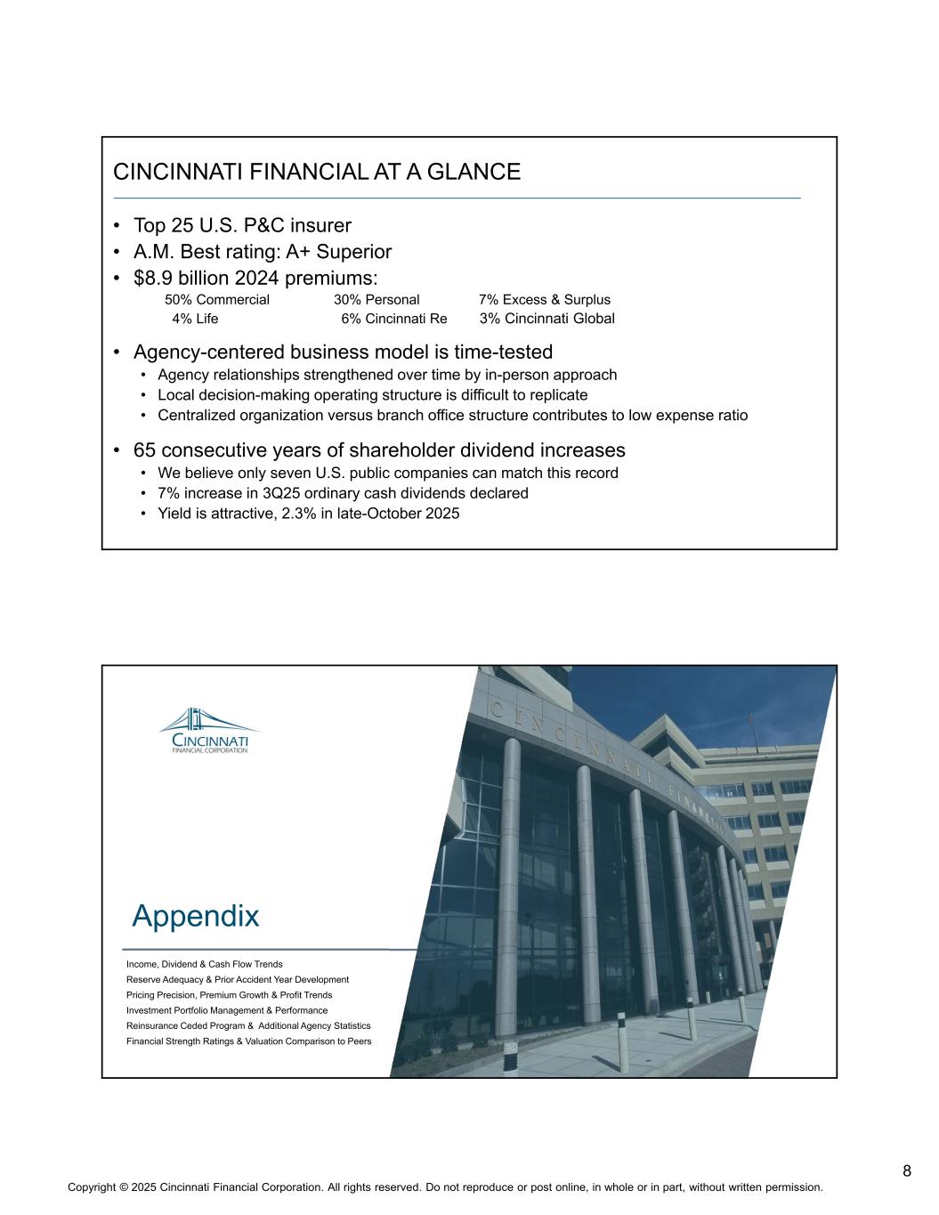 7版权©2025 辛辛那提金融公司。版权所有。未经书面许可,不得全部或部分转载或在网上发布。溢价增长潜力稳步增加我们在指定机构中的份额0.4% 1.5% 3.2% 7.4% 1年或更少2-5年6-10年10年或更多↓辛辛那提的份额总计1660亿美元*目前指定的机构产生的保费(包括约60亿美元的E & S)约为5%。基于2024年标准市场财险代理承保保费(不包括超额和盈余行)丨新任命亦带动保费增长机会─代理关系净额增长55%自2014年底─ 2020-24年期间任命的机构总计产生570亿美元*标准线业务*与辛辛那提保险市场指定的机构所代表的所有承运人就75%的代理典型风险编写的估计年度财产伤亡保费2024净收益保费E & S险种7%商业险种50%个人险种30%其他9%人寿4%合并88.89亿美元商业财产16%商业意外险18%商业汽车11%工人赔偿3%其他Comm 5%超额&盈余7%辛辛那提再6%辛辛那提全球3%房主16%个人汽车11%其他个人4%商业保费约15%=年均保费< 1万美元& 35% > 10万美元的保单;86% HO账户包括汽车财产保险85.68亿美元