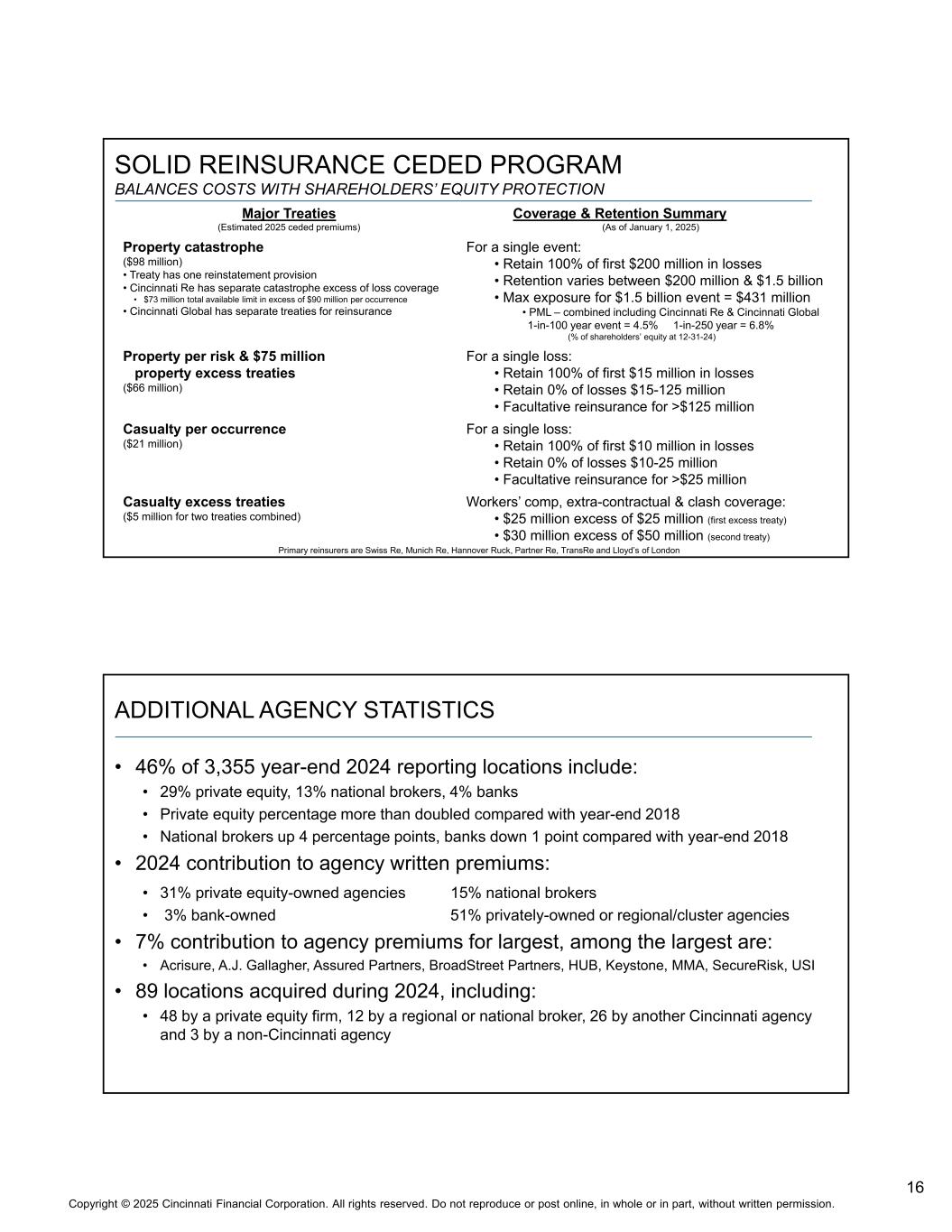 16版权©2025 辛辛那提金融公司。版权所有。未经书面许可,不得全部或部分转载或在网上发布。Solid Reinsurance CEDED program balances costs with shareholders ' equity protection coverage & retention summary(截至1月1日,2025年)单一事件的主要条约(预计2025年分出的保费):•保留前2亿美元损失的100% •保留在2亿美元和15亿美元之间不等•最大风险敞口15亿美元事件= 4.31亿美元• PML –合并后包括Cincinnati Re & Cincinnati Global 100年1次事件= 4.5% 250年1次= 6.8%(12-31-24时股东权益的百分比)财产巨灾(9800万美元)•条约有一项恢复条款• Cincinnati Re有单独的巨灾超额损失保险•总可用限额7300万美元,每次发生超过9000万美元• Cincinnati Global有单独的单次损失再保险条约:•保留前1500万美元损失的100% •保留损失的0% 15-1.25亿美元•临时再保险> 1.25亿美元每项风险的财产& 7500万美元的财产超额条约(6600万美元)单次损失:•保留前1000万美元损失的100% •保留损失的0% 1000-2500万美元•每次发生的损失> 2500万美元的临时再保险(2100万美元)工人赔偿、合同外和冲突保险:• 2500万美元超出2500万美元(第一项超额条约)• 3000万美元超出5000万美元(第二项条约)伤亡超额条约(两项条约合计500万美元)主要再保险公司是瑞士再保险、慕尼黑再保险、汉诺威Ruck、Partner Re,TransRe和伦敦劳合社新增机构统计• 2024年底3,355个报告地点中的46%包括:• 29%的私募股权、13%的国家经纪人、4%的银行•与2018年底相比,私募股权百分比增加了一倍以上•国家经纪人增加了4个百分点,银行比2018年底减少了1个百分点• 2024年对代理承保保费的贡献:• 31%的私募股权拥有的机构15%的国家经纪人• 3%的银行拥有的51%的私营或区域/集群机构•对代理保费的贡献最大的是7%,其中最大的是:• Acrisure、A.J. Gallagher、Assured Partners、BroadStreet Partners、HUB、Keystone、MMA、SecureRisk,USI • 2024年期间收购的89个地点,其中:• 48个由私募股权公司收购,12个由区域或全国性经纪人收购,26个由另一家辛辛那提机构收购,3个由非辛辛那提机构收购