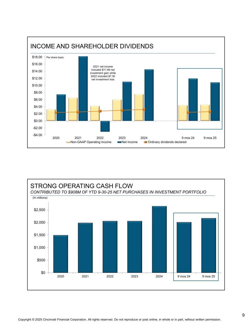 8版权©2025 辛辛那提金融公司。版权所有。未经书面许可,不得全部或部分转载或在网上发布。辛辛那提金融一览•美国25大财险公司• A.M.最佳评级:A +优越•89亿美元2024年保费:50%商业30%个人7%超额&盈余4%人寿6%辛辛那提再3%辛辛那提全球•以代理为中心的商业模式经过时间考验•通过面对面的方式随着时间的推移加强代理关系•当地决策运营结构难以复制•集中式组织相对于分支机构结构有助于低费用率•连续65年股东分红增加•我们认为仅有七家美国上市公司能达到这一记录•宣布的2015年第三季度普通现金股息增长7% •收益率具有吸引力,2025年10月下旬的收入、股息和现金流趋势为2.3%储备充足&上一个事故年的发展定价精度、保费增长和利润趋势投资组合管理&业绩再保险分出计划&附加机构统计财务实力评级&估值与同行的比较附录