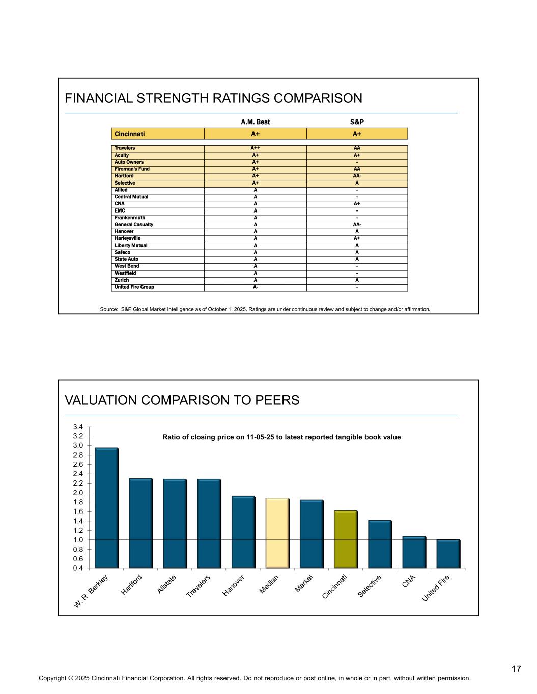 17版权©2025 辛辛那提金融公司。版权所有。未经书面许可,不得全部或部分转载或在网上发布。财务实力评级对比S & PA.M. Best A + A + Cincinnati AAA + + Travelers A + A + Acuity-A + Auto Owners AAA + Fireman's Fund AA-A + Hartford AA + Selective-AAllied-ACentral Mutual A + ACNA-AEMC-AFrankenmuth AA-AGeneral Casualty AAHanover A + AHarleysville AALiberty Mutual AASafeco AAState Auto-ASWest Bend-AWestfield AAZurich-A-United Fire Group资料来源:截至2025年10月1日的标普全球市场情报。评级正在持续审查中,可能会发生变化和/或确认。与同行的估值比较0.4 0.6 0.8 1.0 1.2 1.4 1.6 1.8 2.0 2.2 2.4 2.6 2.8 3.0 3.2 3.4 11-05-25收盘价与最新报告有形账面价值的比率