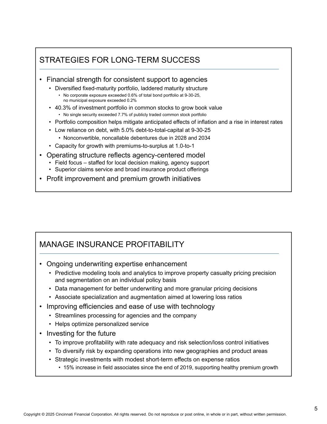 4版权©2025 辛辛那提金融公司。版权所有。未经书面许可,不得全部或部分转载或在网上发布。业绩目标&趋势•年初至今9-30-25年的VCR为13.8%,按年计算,超过年度目标:未来五年年均10%至13% •投资收益前净利润贡献5.2% •非经营项目贡献8.6%,其中7.1%来自权益证券组合投资收益•与长期目标相比,年初至今9-30-25年的相关业绩驱动因素:•财险净承保保费增长10%,而行业2025年6个月报告为6% •综合比率为98.4%,略高于我们92%至98%的长期目标范围•截至2024年底,15%的投资收入增长超过9.7%的五年复合年增长率•尽管为我们历史上最大的灾难事件支付了款项,但经营现金流有所增加•经营活动产生的净现金流为21.65亿美元,增长8% •与2024年前九个月相比,支付的巨灾损失增加了4.73亿美元2025年第三季度亮点•每股收益为7.11美元,而2024年第三季度为每股5.20美元•非美国通用会计准则营业收入从去年的2.24亿美元增长了一倍多,达到4.49亿美元•与2024年第三季度相比,每股收益增加1.91美元,其中0.19美元来自仍持有的股本证券的公允价值变动•投资收益增长14% •利息收入增长21%,股息收入增长1% •财险净承保保费增长9% •平均续期定价提高:商业险种上调中单位数百分率,E & S上调高单位数,个人险种上调高单位数•综合比率为88.2%,比3Q24低9.2个百分点• 3Q25改善包括比当前大灾前事故年度业绩提高2.1个百分点和巨灾损失降低9.3个百分点,部分被先前事故年度不太有利的发展所抵消