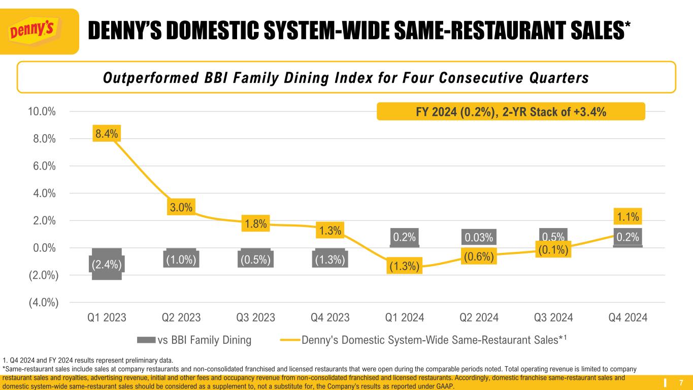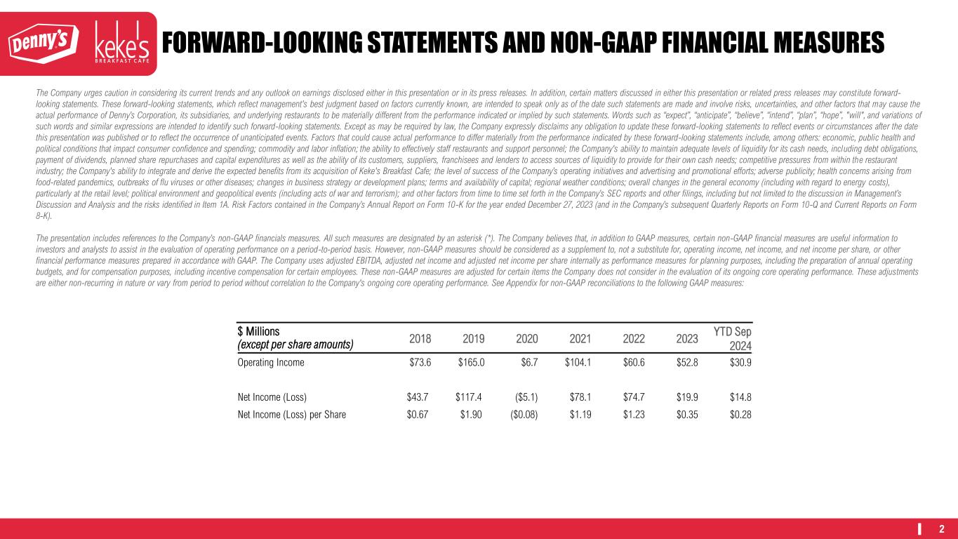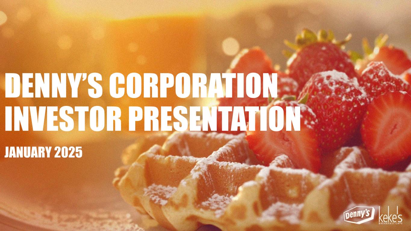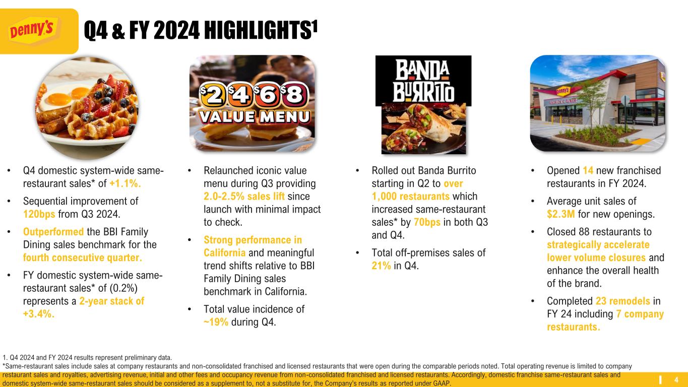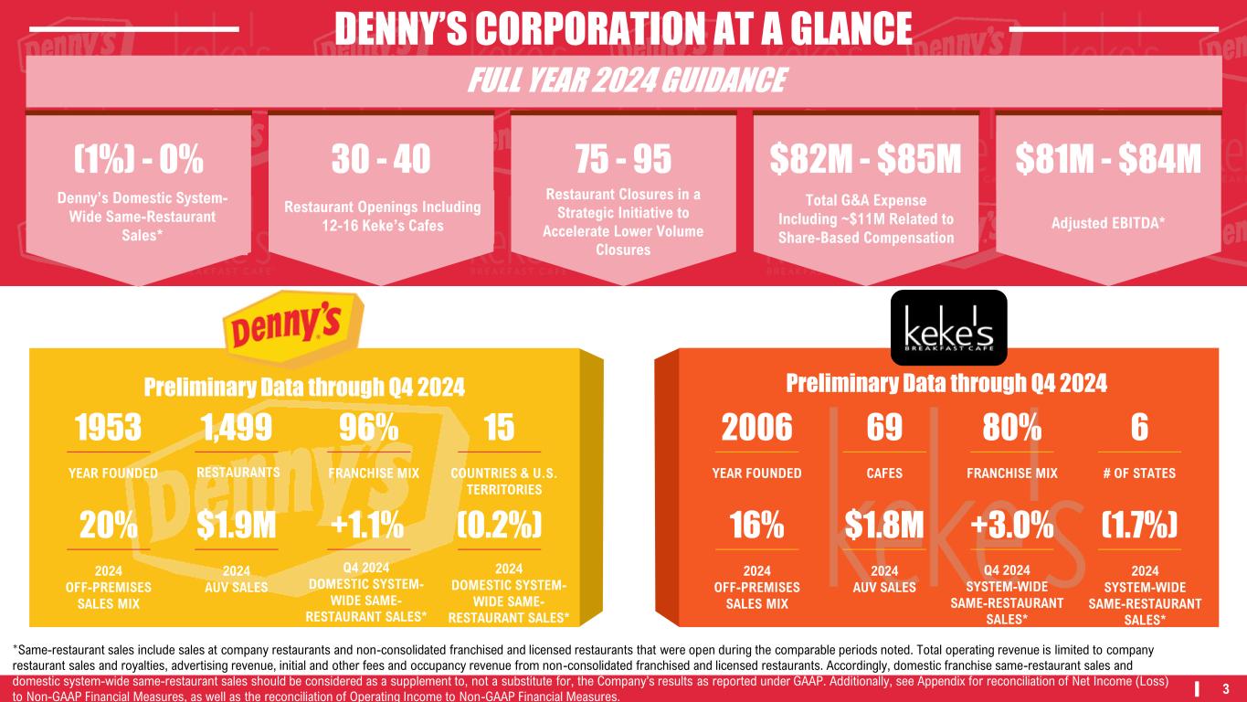 3 + 3.0% 2024年Q4全系统同餐厅销售额*(1.7%)2024年全系统同餐厅销售额*6 # of States $ 180万2024 AUV sales 2006 year founded 80% franchise mix16 % 2024 off-Premises sales mix69 cafes + 1.1% Q4 2024 domestic system wide-same restaurant sales*(0.2%)2024年国内全系统相同餐厅销售*15个国家和美国领土190万美元2024年AUV销售1953年成立96%特许经营权混合20% 2024年场外销售混合1,499家餐厅Denny’s corporation at a glance Denny’s domestic system wide same-restaurant sales*(1%)-0% 75-95总G & A费用,包括与股份补偿相关的约1100万美元8200万美元-$ 85M30-40家餐厅开业,包括12-16家Keke’s cafes调整后EBITDA*8100万美元-8400万美元2024年全年指导餐厅关闭一项战略举措,以加速减少关店数量*同店销售额包括公司餐厅的销售额以及在所述可比期间营业的非合并特许经营和特许经营餐厅的销售额。总营业收入仅限于公司餐厅销售额和特许权使用费、广告收入、初始费用和其他费用以及来自非合并特许和特许餐厅的占用收入。因此,国内特许经营同餐厅销售额和国内全系统同餐厅销售额应被视为对公司按公认会计原则报告的业绩的补充,而不是替代。此外,有关净收入(亏损)与非GAAP财务指标的对账,以及营业收入与非GAAP财务指标的对账,请参见附录。截至2024年第四季度的初步数据截至2024年第四季度的初步数据