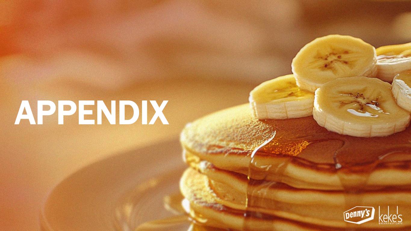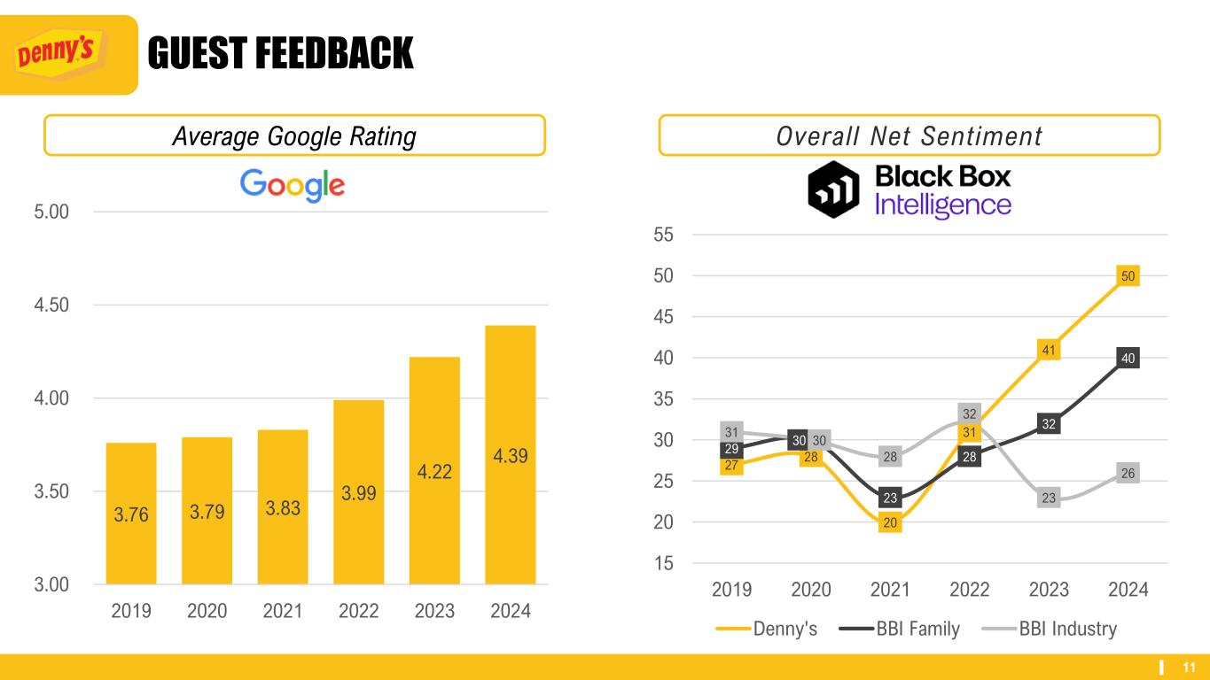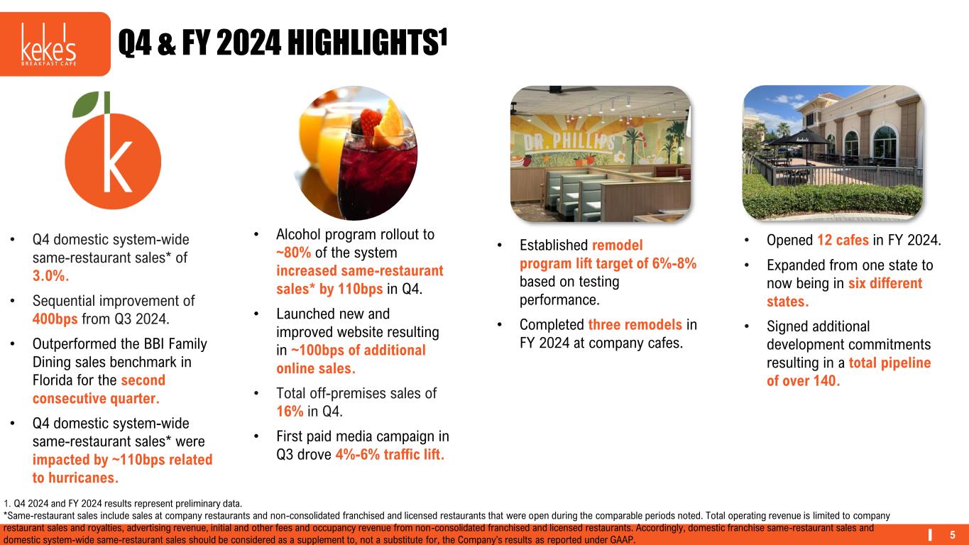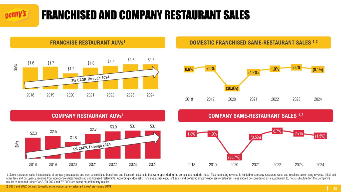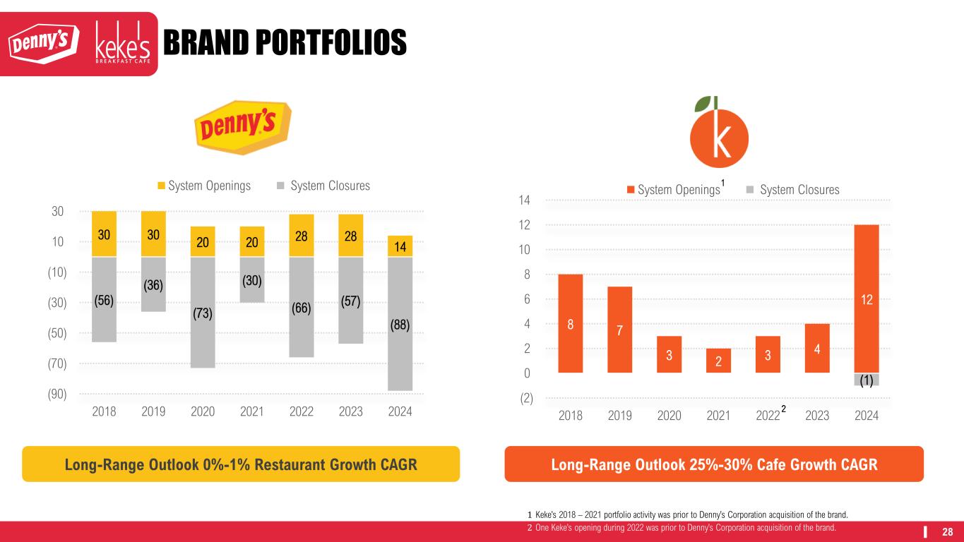 3 + 3.0% 2024年Q4全系统同餐厅销售额*(1.7%)2024年全系统同餐厅销售额*6 # of States $ 180万2024 AUV sales 2006 year founded 80% franchise mix16 % 2024 off-Premises sales mix69 cafes + 1.1% Q4 2024 domestic system wide-same restaurant sales*(0.2%)2024年国内全系统相同餐厅销售*15个国家和美国领土190万美元2024年AUV销售1953年成立96%特许经营权混合20% 2024年场外销售混合1,499家餐厅Denny’s corporation at a glance Denny’s domestic system wide same-restaurant sales*(1%)-0% 75-95总G & A费用,包括与股份补偿相关的约1100万美元8200万美元-$ 85M30-40家餐厅开业,包括12-16家Keke’s cafes调整后EBITDA*8100万美元-8400万美元2024年全年指导餐厅关闭一项战略举措,以加速减少关店数量*同店销售额包括公司餐厅的销售额以及在所述可比期间营业的非合并特许经营和特许经营餐厅的销售额。总营业收入仅限于公司餐厅销售额和特许权使用费、广告收入、初始费用和其他费用以及来自非合并特许和特许餐厅的占用收入。因此,国内特许经营同餐厅销售额和国内全系统同餐厅销售额应被视为对公司按公认会计原则报告的业绩的补充,而不是替代。此外,有关净收入(亏损)与非GAAP财务指标的对账,以及营业收入与非GAAP财务指标的对账,请参见附录。截至2024年第四季度的初步数据截至2024年第四季度的初步数据