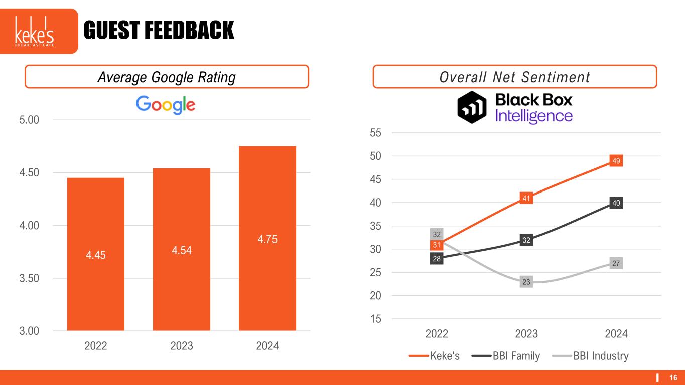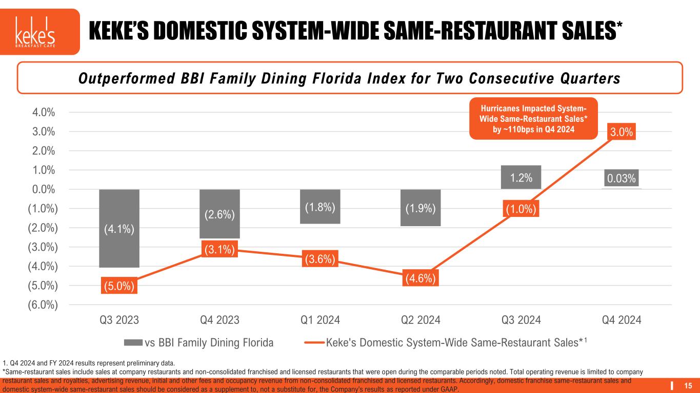 15 KEKE的国内全系统同餐厅销售*连续两个季度跑赢BBI家庭餐饮佛罗里达指数(4.1%)(2.6%)(1.8%)(1.9%)1.2% 0.03%(5.0%)(3.1%)(3.6%)(4.6%)(1.0%)3.0%(6.0%)(5.0%)(4.0%)(3.0%)(2.0%)(1.0%)0.0% 1.0% 2.0% 3.0% 4.0% Q3 2023 Q4 2023 Q1 2024 Q2 2024 Q3 2024 Q4 2024 vs 丨BBI家庭餐饮Florida Keke的国内全系统同餐厅销售额*飓风影响全系统同餐厅销售*2024年第四季度下降约110bps 11。2024年第四季度和2024财年业绩为初步数据。*同店销售额包括公司餐厅的销售额以及在所述可比期间营业的非合并特许经营和特许经营餐厅的销售额。总营业收入限于公司餐厅销售额和特许权使用费、广告收入、初始费用和其他费用以及来自非合并特许和特许餐厅的占用收入。因此,国内特许经营同餐厅销售额和国内全系统同餐厅销售额应被视为对公司按公认会计原则报告的业绩的补充,而不是替代。