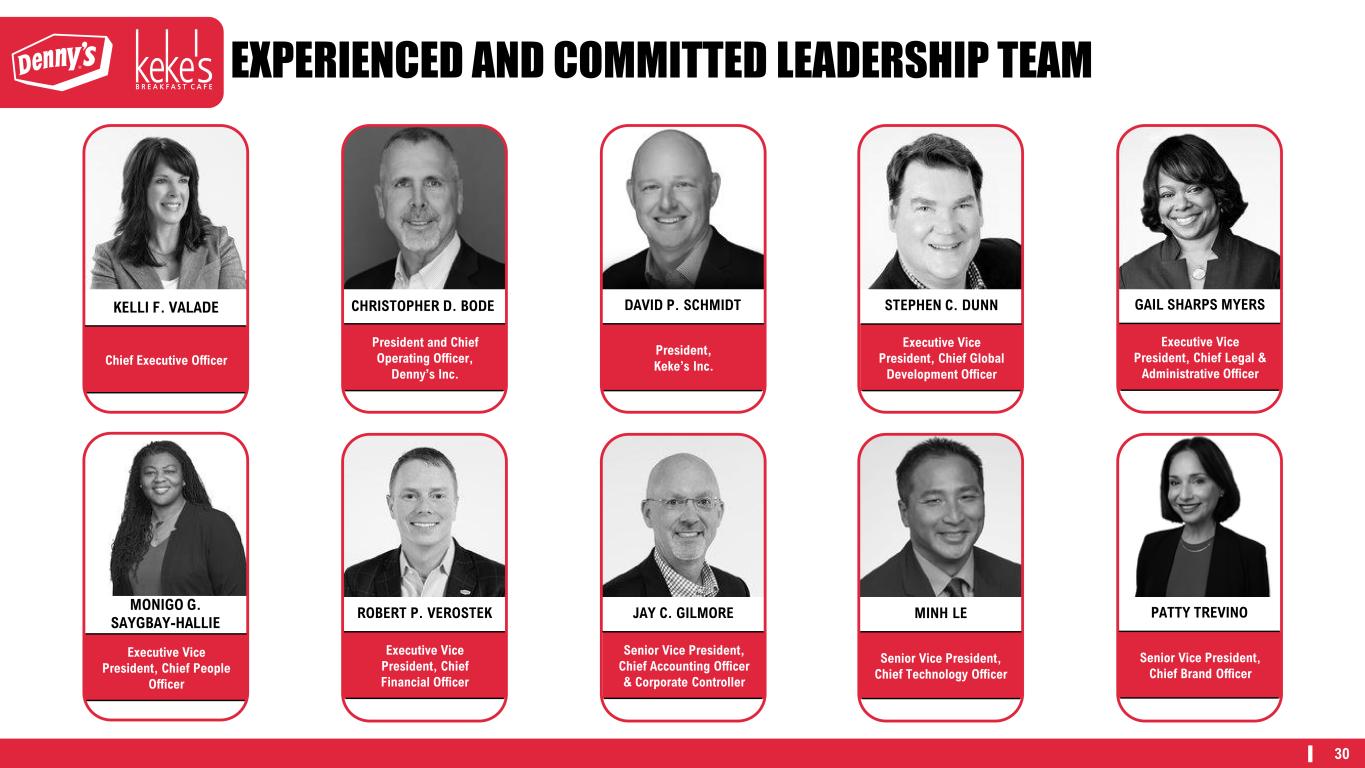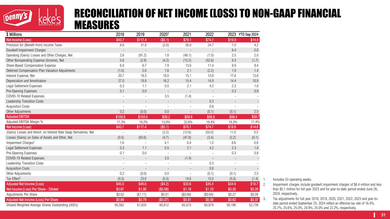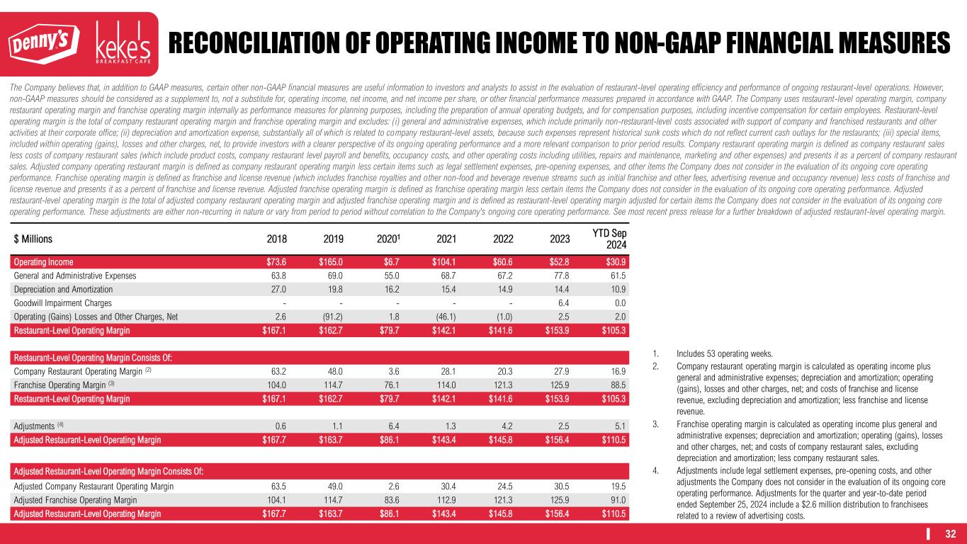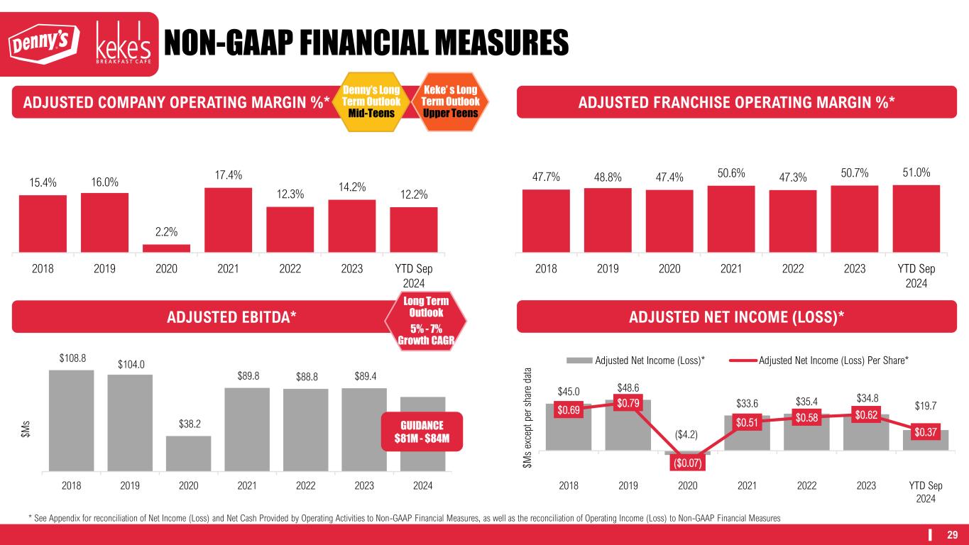 29项非公认会计原则财务措施*有关经营活动提供的净收入(亏损)和净现金与非GAAP财务指标的对账,请参见附录,也是作为营业收入(亏损)与非公认会计准则财务指标的对账15.4% 16.0% 2.2% 17.4% 12.3% 14.2% 12.2% 201820192020202120222023 YTD Sep2024 $ 108.8 $ 104.0 $ 38.2 $ 89.8 $ 88.8 $ 89.4 2018201920202021202220232024 $ M s $ 45.0 $ 48.6($ 4.2)$ 33.6 $ 35.4 $ 34.8 $ 19.7 $ 0.69 $ 0.79($ 0.07)$ 0.51 $ 0.58 $ 0.62 $ 0.37 201820192020202120222023 YTD Sep2024调整后净收入(亏损)*调整后每股净收益(亏损)*47.7% 48.8% 47.4% 50.6% 47.3% 50.7% 51.0% 2018201920202021202220222023年初至今2024年9月调整后公司营业差额%*调整后的特许经营利润率%*经调整EBITDA*调整后净收入(亏损)*$ M s ex ce pt p er s hare d at a long term outlook 5%-7% growth CAGR Denny’s long term outlook mid-teens Keke’s long term outlook Upper teens guidance $ 8100万-$ 8400万