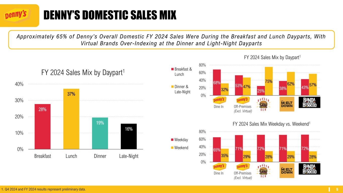8丹尼国内销售额1丹尼2024年Q4国内平均周销售额约为38,900美元$ 8.0 $ 8.1 $ 7.9 $ 7.4 $ 7.1 $ 7.6 $ 7.5 $ 7.2 $ 7.2 $ 7.0 $ 7.6 $ 7.5 $ 7.4 $ 8.1 $ 26.2 $ 27.0 $ 25.2 $ 28.3 $ 28.1 $ 28.9 $ 29.1 $ 30.3 $ 29.6 $ 29.2 $ 30.6 $ 30.8 $ 34.3 $ 35.2 $ 33.1 $ 35.7 $ 35.1 $ 36.5 $ 36.5 $ 37.5 $ 36.7 $ 36.8 $ 38.1 $ 37.2 $ 38.923% 23% 24% 21% 20% 21% 21% 21% 19% 19% 20% 20% 20% 20% 21% 0% 5% 10% 15% 20% 25% 30% $ 0.0 $ 5.0 $ 10.0 $Q2‘23 Q3’23 Q4‘23 Q1’24 Q2‘24 Q3’24 Q4 ' 24 to 24 to ta l o ff-p re m is es s al es a s % o f to ta l s al es a ve ra ge w ee kl y s al es(000美元)2 Denny的总楼外销售额Denny的内部销售额Denny的总销售额非内部销售额占总销售额的百分比1。2024年第四季度和2024财年业绩为初步数据。2.国内平均每周销售额反映了Denny专有销售点(POS)系统上公司和餐厅的销售额。