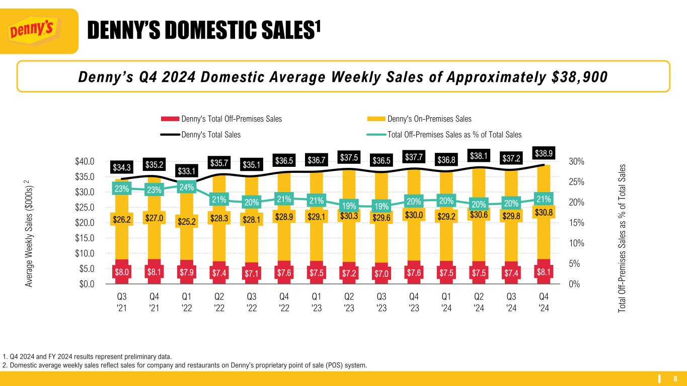 7 Denny的国内全系统同餐厅销售*连续四个季度跑赢BBI家庭餐饮指数(2.4%)(1.0%)(0.5%)(1.3%)0.2% 0.03% 0.5% 0.2% 8.4% 3.0% 1.8% 1.3%(1.3%)(0.6%)(0.1%)1.1%(4.0%)(2.0%)0.0% 2.0% 4.0% 6.0% 8.0% 10.0% Q1 2023Q2 2023Q3 2023Q3 2023Q4 2023Q1 2024Q2 2024Q3 2024Q4 2024 vs TERM0家庭餐饮Denny国内全系统同餐厅销售额*2024财年(0.2%),2年期叠加+ 3.4% 11。2024年第四季度和2024财年业绩为初步数据。*同店销售额包括公司餐厅的销售额以及在所述可比期间营业的非合并特许经营和特许经营餐厅的销售额。总营业收入限于公司餐厅销售额和特许权使用费、广告收入、初始费用和其他费用以及来自非合并特许和特许餐厅的占用收入。因此,国内特许经营同餐厅销售额和国内全系统同餐厅销售额应被视为对公司按公认会计原则报告的业绩的补充,而不是替代。