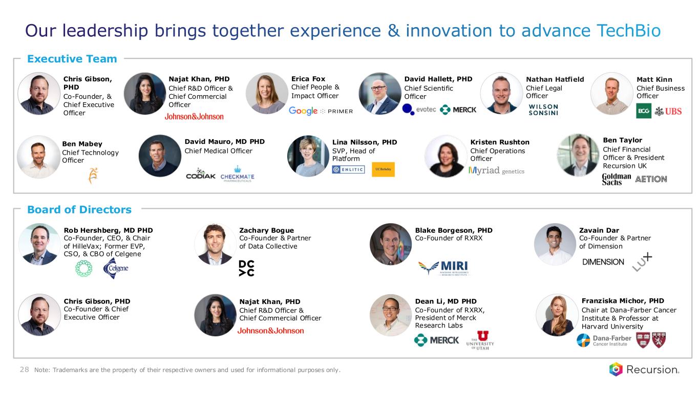 董事会Dean Li,MD博士RXRX联合创始人,Zavain Dar为Dimension的联合创始人兼合伙人Rob Hershberg为TERM3TERM3,MD博士联合创始人、首席执行官兼HilleVax主席;Celgene前执行副总裁、CSO、CBO为Zachary Bogue,Data Collective Najat Khan,博士首席研发官兼首席商务官Franziska Michor,Dana-Farber癌症研究所博士主席兼哈佛大学执行团队教授Ben Mabey首席技术官Kristen Rushton首席运营官David MauroTERM7,MD博士首席医疗官Matt Kinn首席商务官NaNaPHD首席研发官兼首席商务官Erica Fox首席人员与影响官David Hallett、PHD首席科学官Lina Nilsson、PHD高级副总裁、平台负责人Blake Borgeson、RXRX的联合创始人PHD注:商标是其各自所有者的财产,仅供参考。28 Chris Gibson,PHD联合创始人兼首席执行官Chris Gibson,PHD联合创始人兼首席执行官我们的领导力汇集了经验和创新,以推进TechBio Ben Taylor首席财务官 &总裁Recursion UK Nathan Hatfield首席法务官