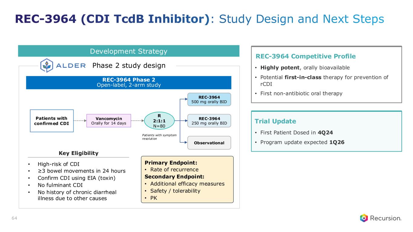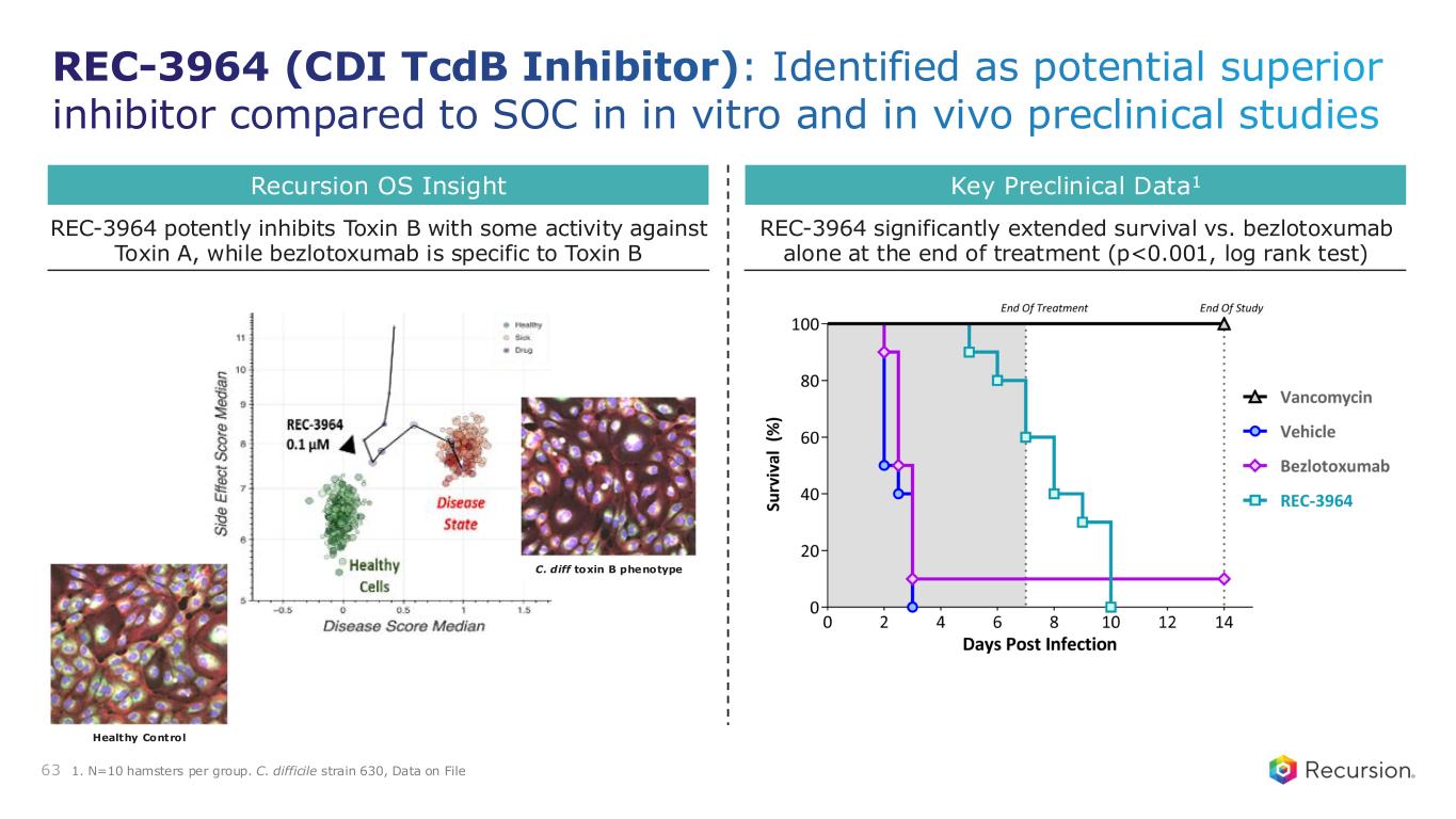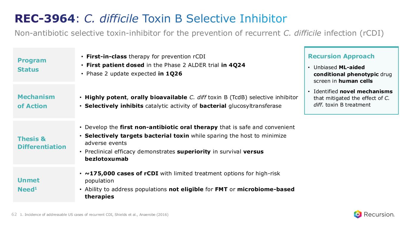 其他REC-3964(CDI TCDB抑制剂):一种安全且耐受性良好的艰难梭菌毒素B选择性抑制剂,用于预防复发性艰难梭菌(RCDI)我们的方法:在人体细胞中进行无偏见的ML辅助条件表型药物筛选,以确定拯救艰难梭菌毒素B治疗效果的新机制•潜在的同类首创非抗生素口服毒素B选择性抑制剂,用于预防RCDI •耐受性良好,1期没有与治疗相关的停药或SAE •招募正在进行中,预计2期更新将于2016年1季度•使用RWD/ML REC-3964(TCDB)Recursion OS:REC-3964发现20确定的30 +个新试验地点