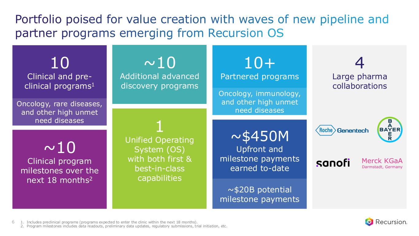 64大型制药合作10临床和临床前项目1肿瘤学、罕见病和其他高未满足需求的疾病~未来18个月的10个临床项目里程碑2 1具有一流和同类最佳能力的统一操作系统(OS)~10额外的先进发现项目10 +合作项目~4.5亿美元的预付款和里程碑付款迄今已获得~20B美元的潜在里程碑付款肿瘤学、免疫学和其他高未满足需求的疾病1。包括临床前项目(预计在未来18个月内进入临床的项目)。2.计划里程碑包括数据读数、初步数据更新、监管提交、试验启动等。随着Recursion OS涌现出一波又一波的新管道和合作伙伴计划,投资组合为价值创造做好了准备