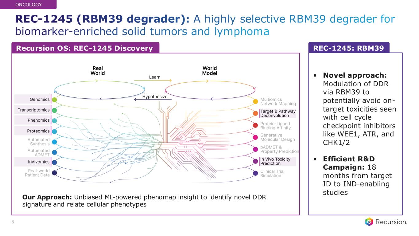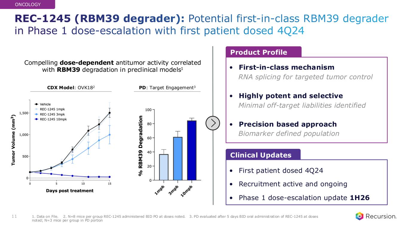 项目状态•实体瘤中潜在的一流RBM39降解剂•首例患者于2024年第四季度给药•预计在1H26中剂量递增的1期单一疗法更新作用机制•通过E3连接酶接头DCAF15降解RBM39的分子胶•破坏RNA剪接以下调细胞周期检查点和DDR网络论文&分化• RBM39表型模拟CDK12,在递归OS中与CDK13不同•通过RBM39靶向DDR生物学的新方法避免了与细胞周期检查点抑制剂(例如CDK12、WEE1、ATR、ATM、PLK1)•选择性RBM39降解剂,ITGA2责任最小,可限制血小板减少症未满足需求1 • > 100,000名实体瘤或淋巴瘤患者在接受一线治疗时经历疾病进展•有可能作为单一药物或与化疗/IO 401联合使用。公司内部估计。假设美国+ EU5的可寻址发病率与生物标志物丰富的实体瘤和其他选定的组织学。2.Paul等人,NAT Rev Drug Discov(2010)递归方法•用于识别生物特征和关联细胞表型的无偏ML辅助基因组学筛选•在不到18个月的时间内将REC-1245从靶点生物学推进到IND使能研究(与工业中的42个月相比2)REC-1245:RBM39降解剂一种用于生物标志物丰富的实体瘤和淋巴瘤的高选择性RBM39降解剂