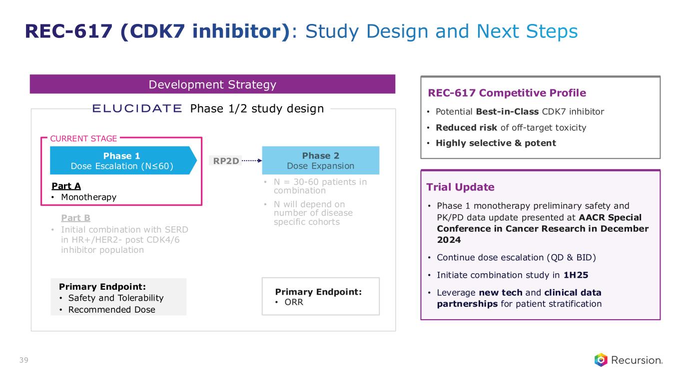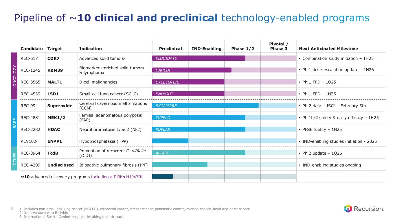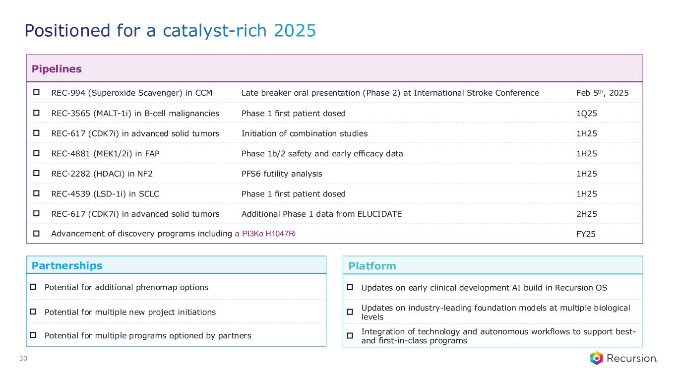 2月5日在国际卒中大会上为CCM晚期断路器口头报告(第2阶段)中的富含催化剂的202530管道REC-994(超氧化物清除剂)定位,2025年REC-3565(MALT-1i)在B细胞恶性肿瘤1期首例患者给药1Q25 REC-617(CDK7i)在晚期实体瘤启动联合研究1H25 REC-4881(MEK1/2i)在FAP 1b/2期安全性和早期疗效数据1H25 REC-2282(HDACi)在NF2 PFS6无效分析中的应用1H25 REC-4539(LSD-1i)在晚期实体瘤中的SCLC 1期首例患者给药1H25 REC-617(CDK7i)来自ELUCIDATE 2H25的额外1期数据发现项目的进展,包括PI3K α H1047RI FY25伙伴关系的额外表现图选项的潜力多个新项目启动的潜力合作伙伴选择的多个项目的潜力Recursion OS中早期临床开发AI构建的平台更新在多个生物学水平上的行业领先基础模型的更新技术集成和自主工作流程,以支持最佳和一流项目