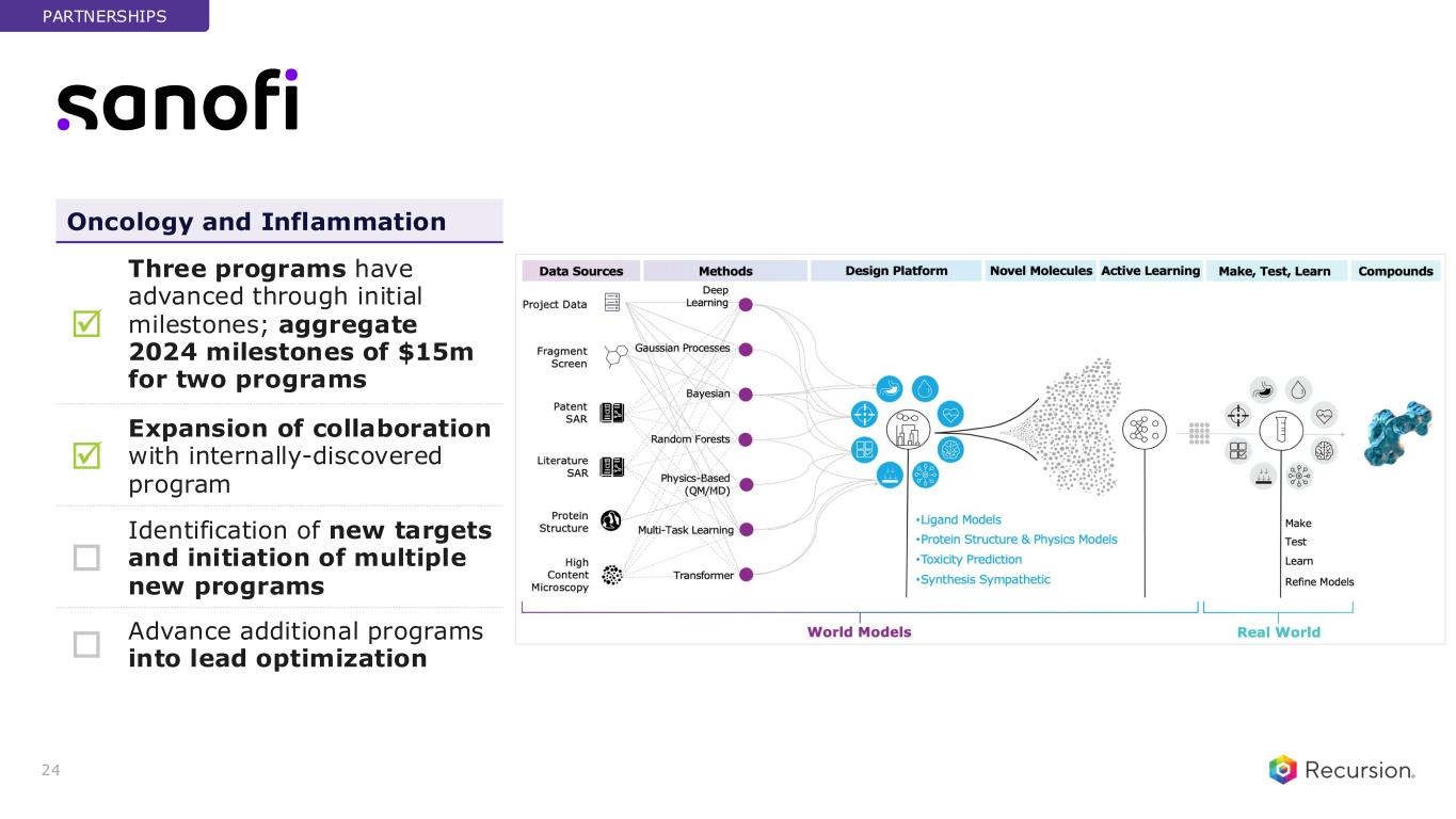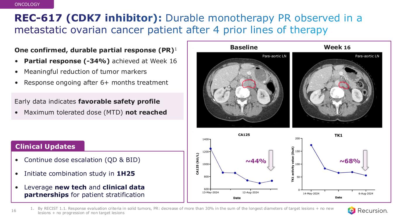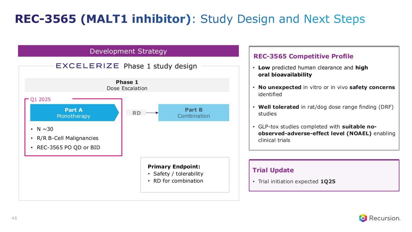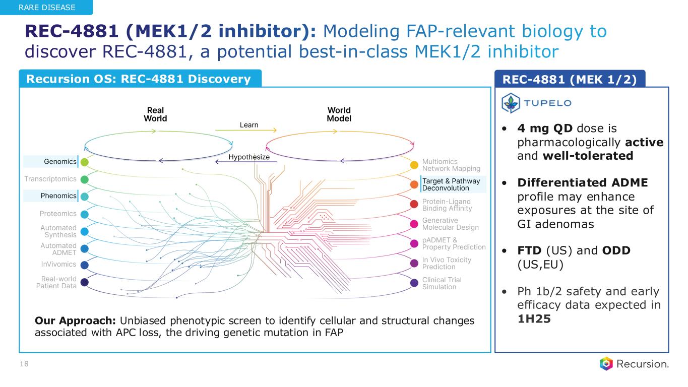 2月5日在国际卒中大会上为CCM晚期断路器口头报告(第2阶段)中的富含催化剂的202530管道REC-994(超氧化物清除剂)定位,2025年REC-3565(MALT-1i)在B细胞恶性肿瘤1期首例患者给药1Q25 REC-617(CDK7i)在晚期实体瘤启动联合研究1H25 REC-4881(MEK1/2i)在FAP 1b/2期安全性和早期疗效数据1H25 REC-2282(HDACi)在NF2 PFS6无效分析中的应用1H25 REC-4539(LSD-1i)在晚期实体瘤中的SCLC 1期首例患者给药1H25 REC-617(CDK7i)来自ELUCIDATE 2H25的额外1期数据发现项目的进展,包括PI3K α H1047RI FY25伙伴关系的额外表现图选项的潜力多个新项目启动的潜力合作伙伴选择的多个项目的潜力Recursion OS中早期临床开发AI构建的平台更新在多个生物学水平上的行业领先基础模型的更新技术集成和自主工作流程,以支持最佳和一流项目