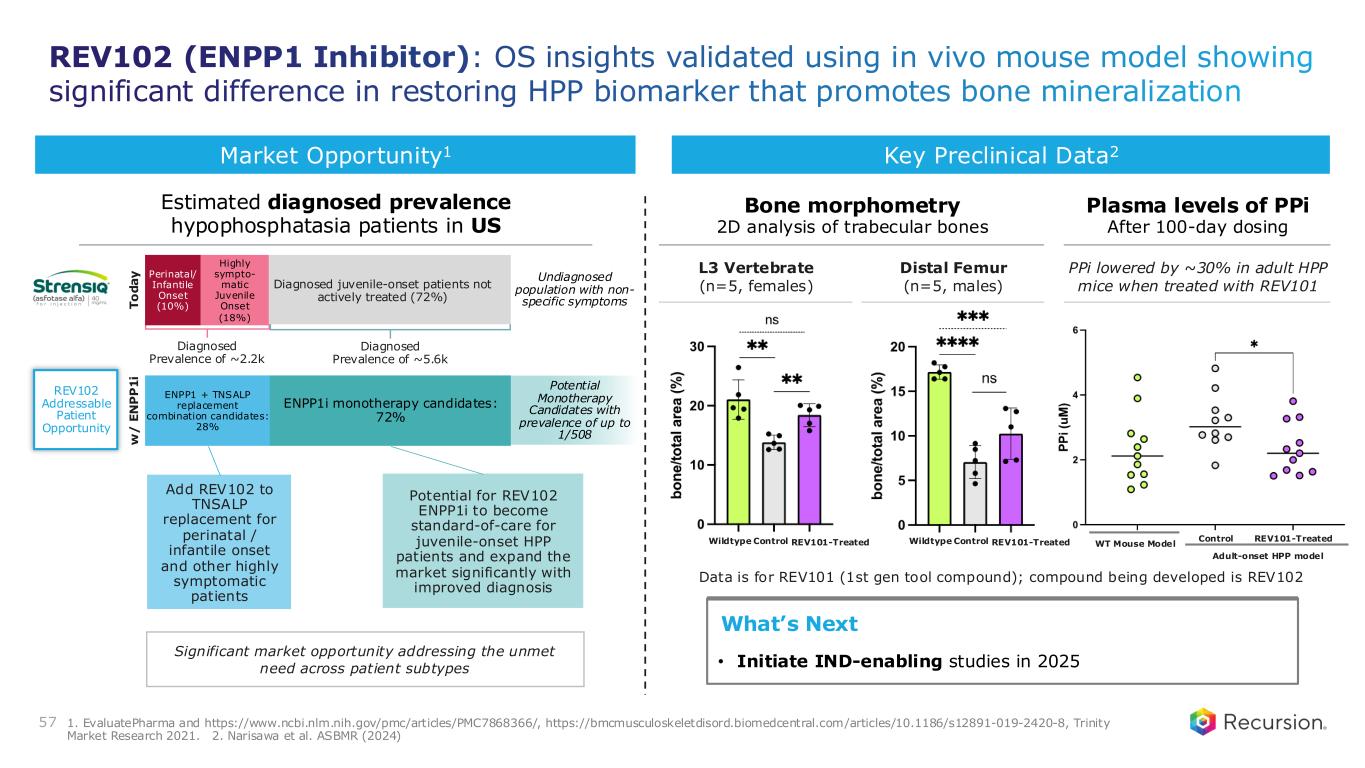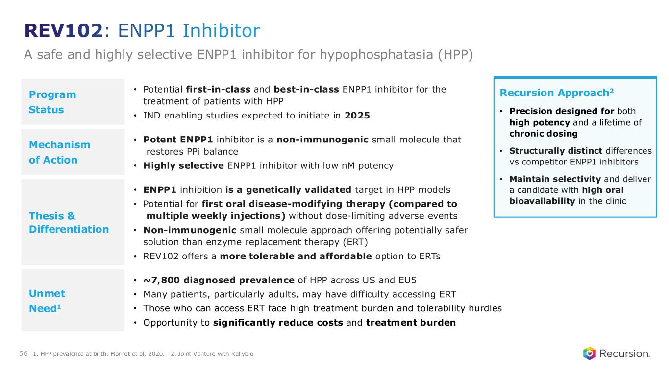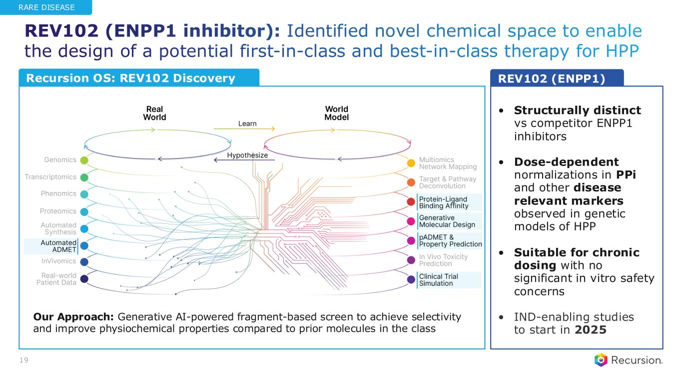 REV102(ENPP1抑制剂):确定了新的化学空间,从而能够设计出一种潜在的同类首创和同类最佳的治疗方法,用于治疗HPP 19种罕见疾病我们的方法:生成AI驱动的基于片段的筛选,与同类中先前的分子相比,实现选择性并改善理化特性•与竞争对手ENPP1抑制剂相比,结构上不同•在HPP遗传模型中观察到的PPi和其他疾病相关标志物的剂量依赖性正常化•适用于慢性给药,无显着的体外安全性担忧• IND赋能研究将于2025年开始Recursion OS:REV102 Discovery REV102(ENPP1)