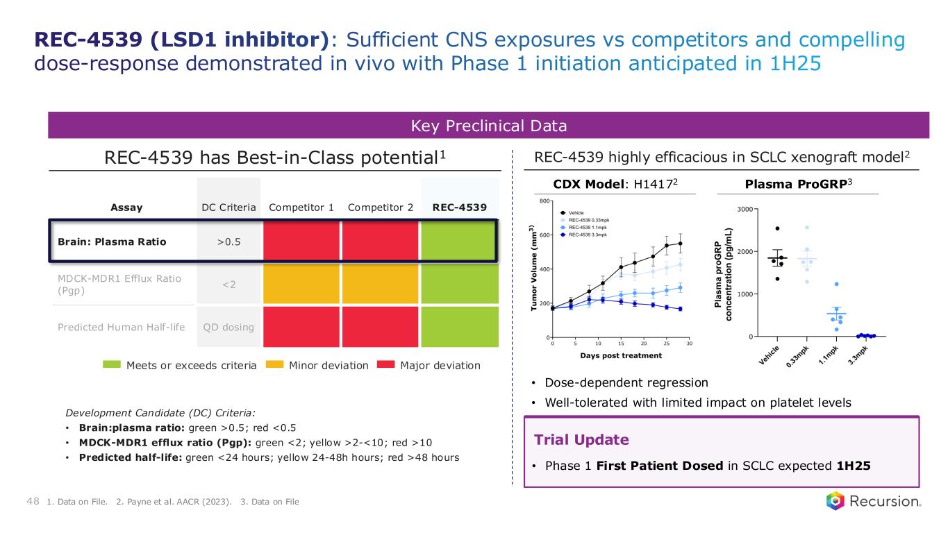 测定DC标准竞争对手1竞争对手2 REC-4539脑:血浆比> 0.5 MDCK-MDR1流出比(PGP)< 2预测的人类半衰期QD给药关键临床前数据REC-4539在SCLC异种移植model2开发候选(DC)中具有同类最佳潜力1 REC-4539高效标准:•脑:血浆比:绿色> 0.5;红色< 0.5 • MDCK-MDR1流出比(PGP):绿色< 2;黄色> 2-< 10;红色> 10 •预测半衰期:绿色< 24小时;黄色24-48h小时;红色> 48小时481。档案上的数据。2.Payne et al. AACR(2023)。3.档案试验更新数据• SCLC预期1H25给药的1期首例患者符合或超过标准微小偏差主要偏差•剂量依赖性回归•耐受性良好,对血小板水平影响有限CDX模型:H14172血浆ProGRP3 REC-4539(LSD1抑制剂):与竞争对手相比,足够的CNS暴露和预计在1H25启动1期的体内证明的令人信服的剂量反应