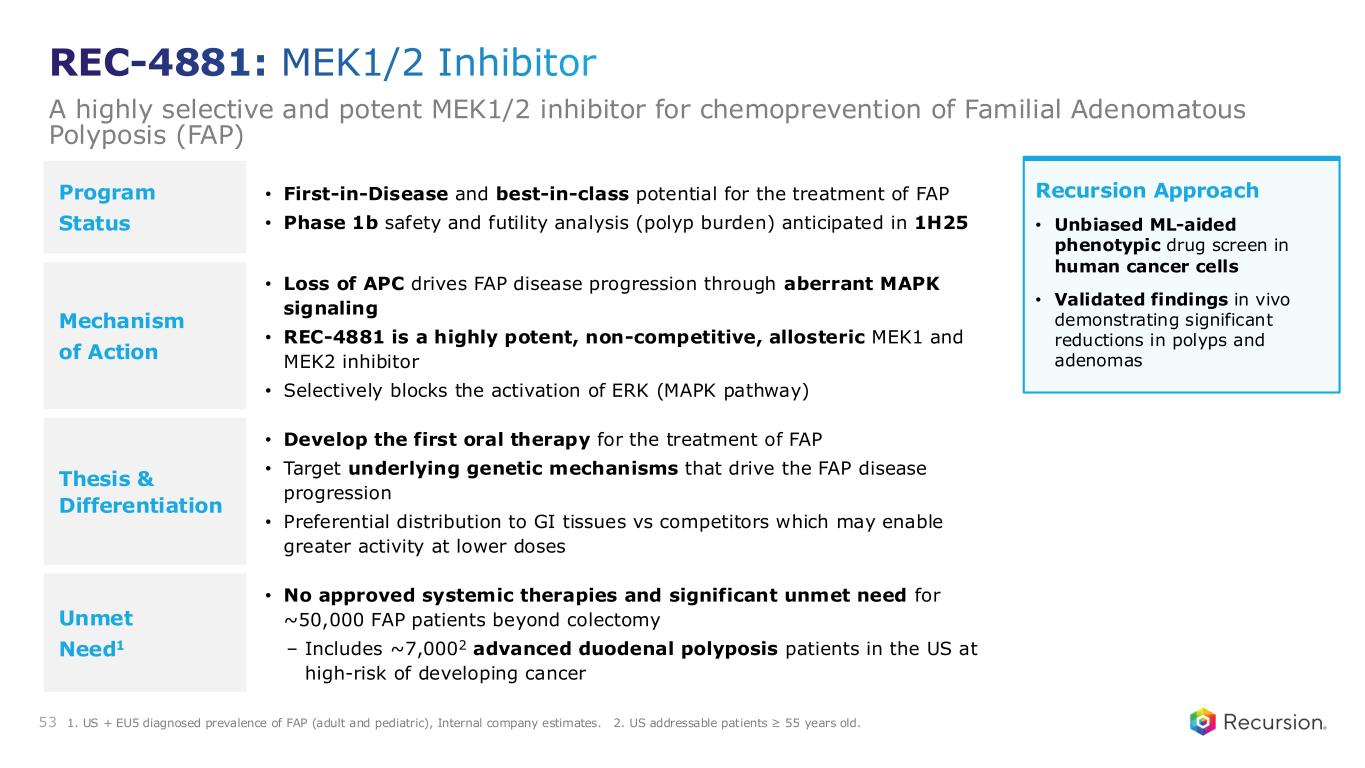 方案状态•治疗FAP的首次疾病和同类最佳潜力• 1H25行动机制中预计的1b期安全性和无效性分析(息肉负担)•丧失APC通过异常的MAPK信号驱动FAP疾病进展• REC-4881是一种高度有效、非竞争性、变构MEK1和MEK2抑制剂•选择性阻断ERK(MAPK通路)的激活Thesis & Differentiation •开发用于治疗FAP的首个口服疗法•靶向驱动FAP疾病进展的潜在遗传机制•优先分配给GI组织而不是竞争对手,这可能会在较低剂量下产生更大的活性未满足的需求1 •结肠切除术后约50,000名FAP患者没有获得批准的全身疗法和显着未满足的需求–包括美国约7,0002名晚期十二指肠息肉病患者,处于发生癌症的高风险531。美国+ EU5确诊FAP患病率(成人和儿科),内部公司估计。2.美国可寻址患者≥ 55岁。递归方法•在人类癌细胞中进行无偏ML辅助的表型药物筛选•体内验证结果证明息肉和腺瘤显着减少REC-4881:MEK1/2抑制剂一种用于家族性腺瘤性息肉病(FAP)化学预防的高选择性和强效MEK1/2抑制剂