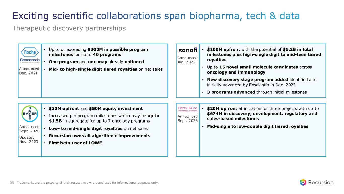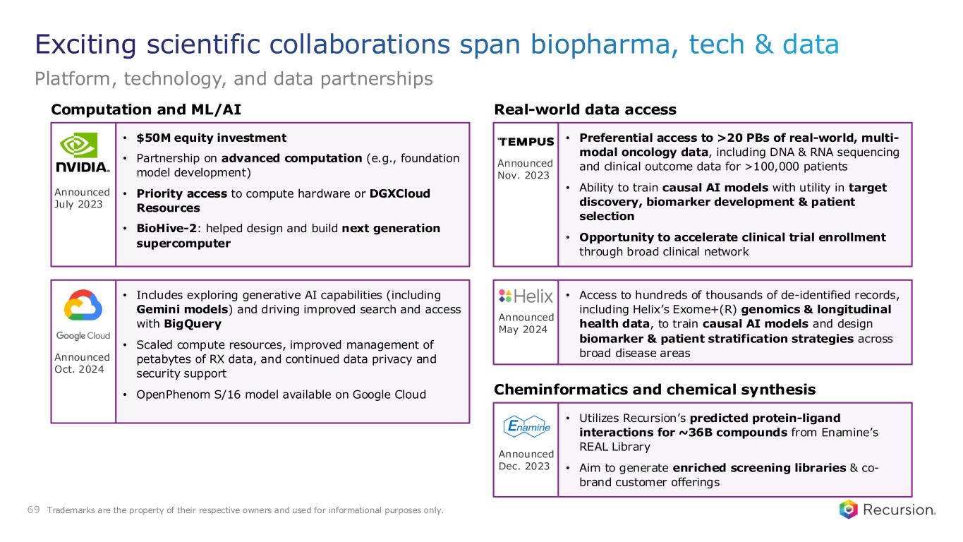 68商标是其各自所有者的财产,仅供参考之用。•多达40个项目的可能项目里程碑高达或超过3亿美元•已选择一个项目和一张地图•净销售额的中高个位数分层版税• 3000万美元预付款和5000万美元的股权投资•每个项目里程碑增加,最多7个肿瘤项目总计可能高达1.5B美元•净销售额的中低个位数特许权使用费• Recursion拥有所有算法改进• LOWE的首个Beta用户•1亿美元的预付款,总里程碑可能为5.2B美元,加上高个位数到十几岁的分层特许权使用费•在肿瘤学和免疫学领域增加多达15个新型小分子候选者•新发现阶段项目已确定并由Exscientia于2023年12月初步推进• 3个项目通过初始里程碑推进•三个项目启动时预付2000万美元,其中高达6.74亿美元用于发现、开发、监管和基于销售的里程碑• 2021年12月宣布的中单位数至低两位数分层特许权使用费2022年1月宣布2023年9月宣布2023年9月宣布2020年9月更新2023年11月2023年令人兴奋的科学合作涵盖生物制药、技术和数据治疗发现合作伙伴关系