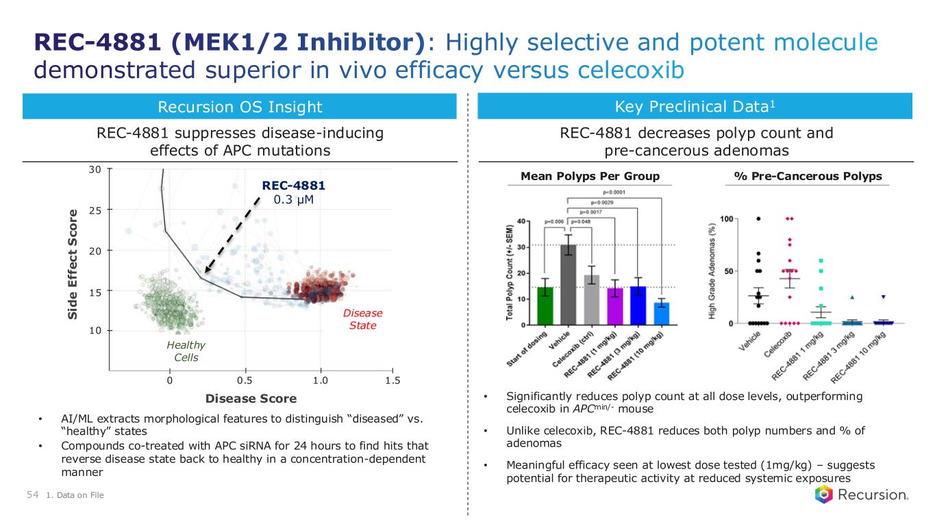 关键临床前数据1 REC-4881可降低息肉计数和癌前腺瘤•在所有剂量水平上均显着降低息肉计数,在APCmin/-小鼠中优于塞来昔布•与塞来昔布不同,REC-4881减少息肉数量和腺瘤百分比•在测试的最低剂量(1mg/kg)下观察到有意义的功效–表明在减少全身暴露时具有潜在的治疗活性Recursion OS Insight S id e e eff e c t S c o r e 302520151000.5 1.0 1.5疾病评分REC-4881 0.3 μ m健康细胞疾病状态• AI/ML提取形态学特征以区分“患病”与“健康”状态•化合物与APC siRNA联合治疗24小时以发现命中以浓度依赖的方式将疾病状态逆转为健康REC-4881抑制APC突变的诱发疾病作用541。档案平均每组息肉%癌前息肉REC-4881(MEK1/2抑制剂)数据:高选择性和强效分子表现出优于塞来昔布的体内疗效