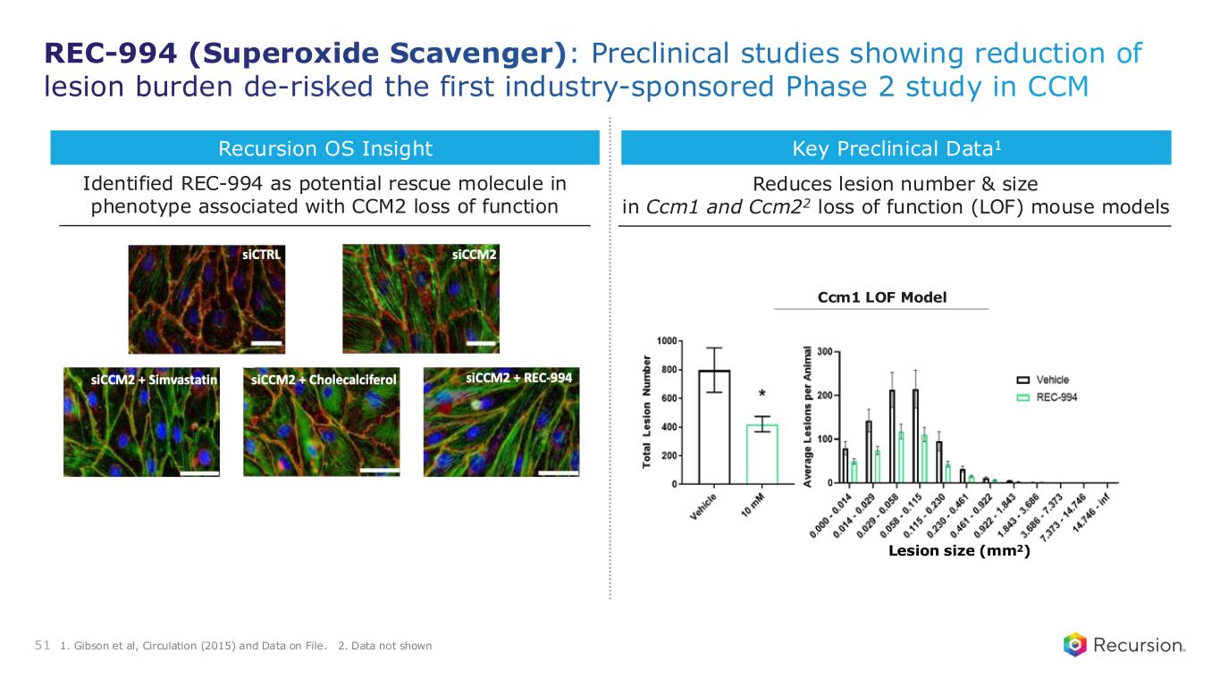病变大小(mm2)关键临床前数据1降低CCM1和CCM22功能丧失(LOF)小鼠模型中的病变数量和大小,确定REC-994为与CCM2功能丧失相关的表型潜在拯救分子递归OS Insight 511。Gibson et al,Circulation(2015)and Data on File。2.数据未显示CCM1 LOF模型REC-994(Superoxide Scavenger):显示病变负担减轻的临床前研究降低了CCM中首个行业赞助的2期研究