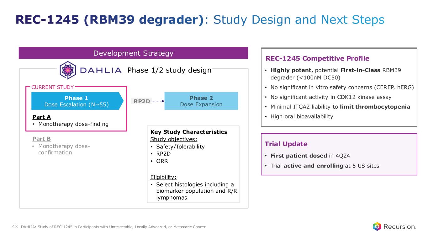 发展战略A部分•单一疗法剂量发现B部分•单一疗法剂量确认型RPTD 1期剂量递增(N~55)1/2期研究设计当前研究关键研究特征研究目标:•安全性/耐受性• RPTD • ORR资格:•选择组织学,包括生物标志物人群和R/R淋巴瘤43试验更新•首例患者于2024年第四季度给药•试验活跃并在5个美国站点入组REC-1245竞争概况•高效、潜在的一流RBM39降解剂(< 100nM DC50)•无重大体外安全性问题(CEREP,hERG)• CDK12激酶测定中无显着活性• ITGA2对限制血小板减少的最小责任•高口服生物利用度DAHLIA:REC-1245在不可切除、局部晚期或转移性癌症REC-1245(RBM39降解剂)参与者中的研究:研究设计和下一步