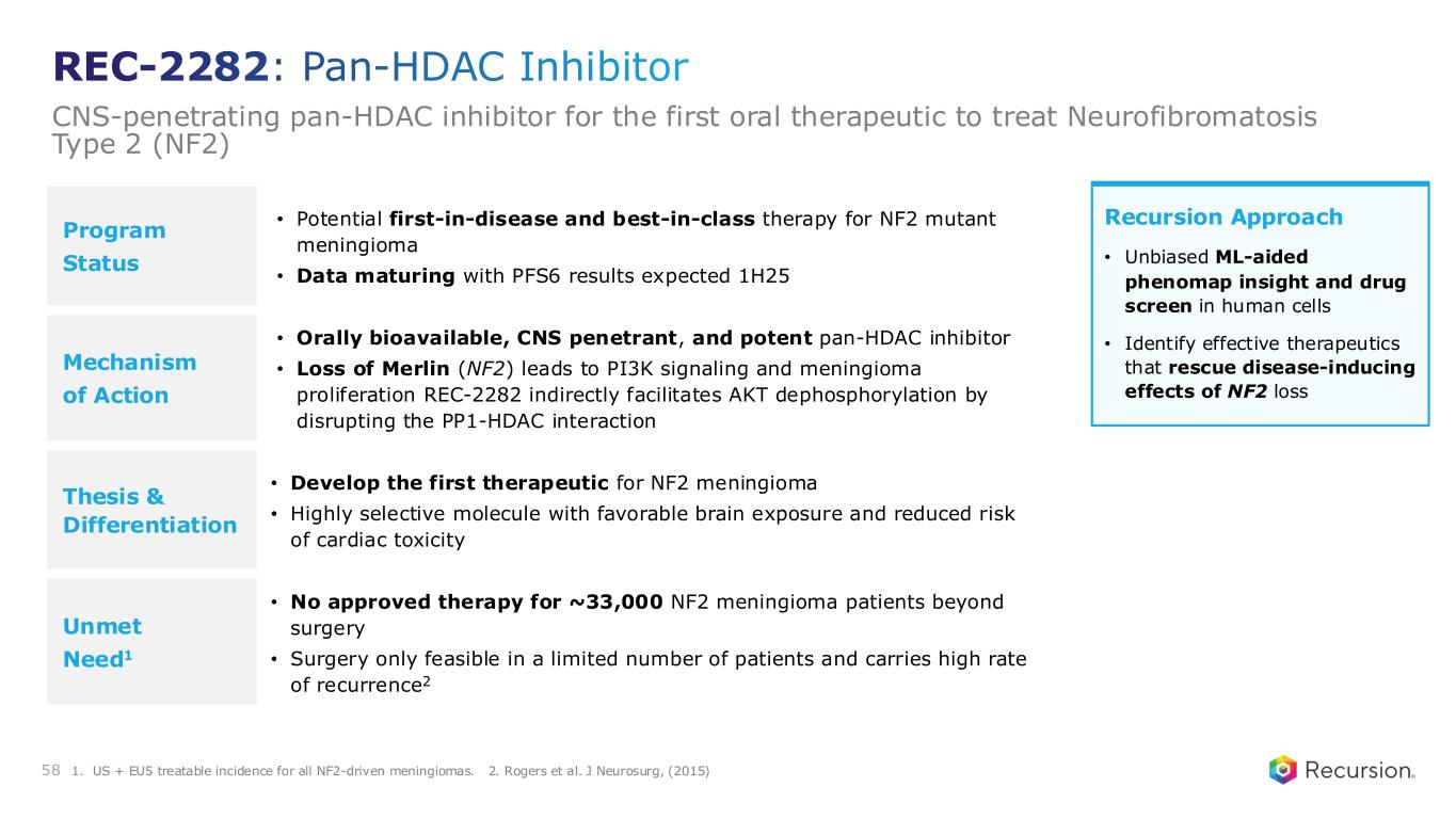 方案状态• NF2突变脑膜瘤的潜在首次发病和同类最佳疗法•数据成熟,预期PFS6结果1H25作用机制•口服生物可利用,CNS渗透剂,和强效泛HDAC抑制剂• Merlin(NF2)缺失导致PI3K信号传导和脑膜瘤增殖REC-2282通过破坏PP1-HDAC相互作用论文间接促进AKT去磷酸化&分化•开发NF2脑膜瘤的首个治疗剂•具有有利的脑暴露和降低心脏毒性风险的高选择性分子未满足需求1 •未批准对约33,000名NF2脑膜瘤患者进行手术以外的治疗•手术仅在有限数量的患者中可行,且复发率高2 581。所有NF2驱动脑膜瘤的US + EU5可治疗发病率。2.罗杰斯等J Neurosurg,(2015)递归方法•在人体细胞中进行无偏ML辅助的表现图洞察和药物筛选•确定可挽救NF2丢失的疾病诱导效应的有效疗法REC-2282:用于治疗2型神经纤维瘤病(NF2)的首个口服疗法的泛HDAC抑制剂CNS穿透泛HDAC抑制剂