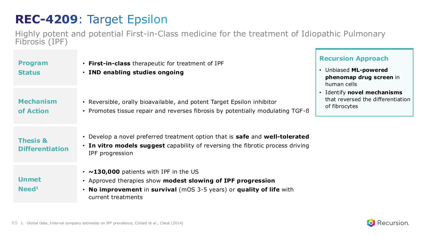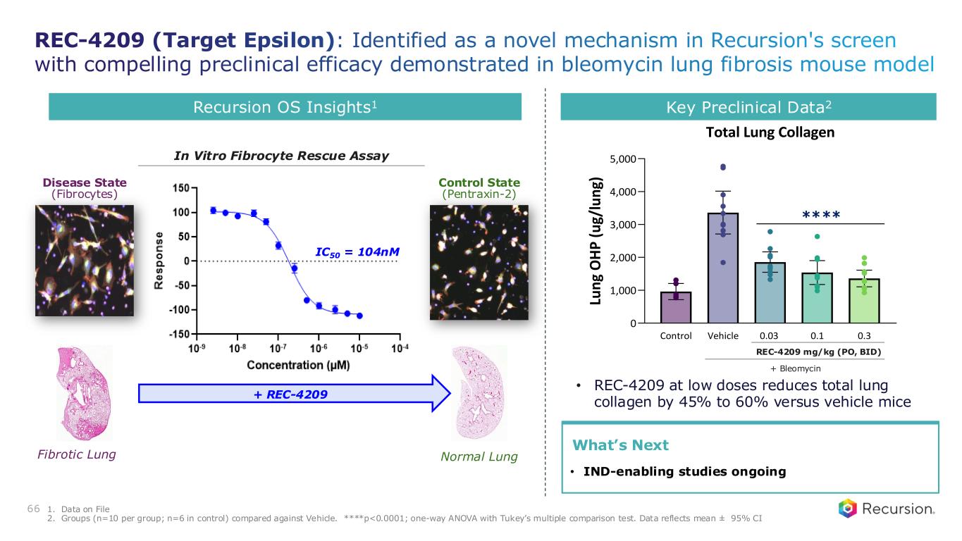 Recursion OS Insights1 • REC-4209在低剂量时与载体小鼠对照载体0.03 0.10.301,0002,0003,0003,0004,0005,000总肺胶原蛋白Lu n g O H P(u g/u n g)疾病状态(纤维细胞)对照状态(pentraxin-2)正常肺+ REC-4209纤维化肺IC50 = 104nm关键临床前数据2 661。文件2上的数据。分组(每组n = 10;对照n = 6)对比Vehicle。****p < 0.0001;单向ANOVA与TUKEY的多重比较试验。数据反映均值± 95% CI REC-4209mg/kg(PO、BID)+博来霉素下一步是什么• IND赋能研究正在进行中****体外纤维细胞拯救试验REC-4209(靶点Epsilon):在Recursion的筛选中被鉴定为一种新机制,在博来霉素肺纤维化小鼠模型中证明了令人信服的临床前疗效