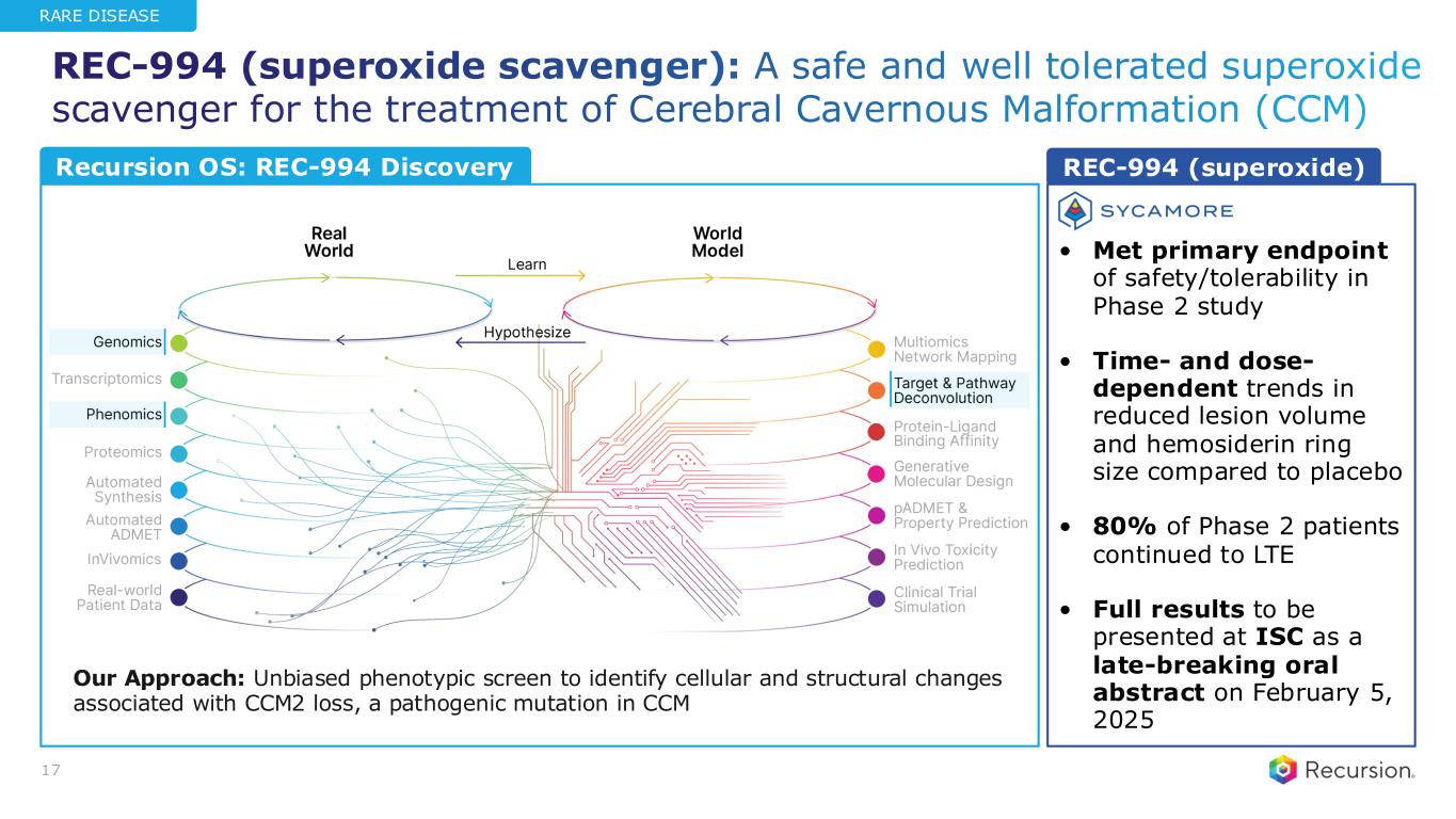 REC-994(超氧化物清除剂):一种安全且耐受性良好的超氧化物清除剂,用于治疗脑海绵状畸形(CCM)17罕见疾病复发OS:REC-994发现•在2期研究中达到了安全性/耐受性的主要终点•与安慰剂相比,病灶体积和含铁血黄素环大小减少的时间和剂量依赖性趋势• 80%的2期患者继续使用LTE •完整结果将于2025年2月5日作为最新的口头摘要在ISC上展示REC-994(超氧化物)我们的方法:无偏表型筛查,以识别与CCM2丢失相关的细胞和结构变化,CCM2丢失是CCM中的一种致病突变