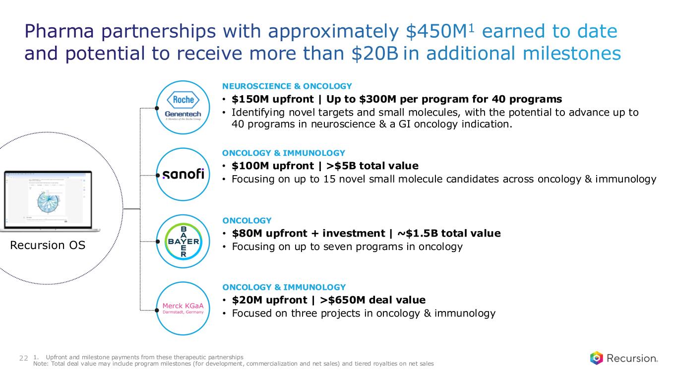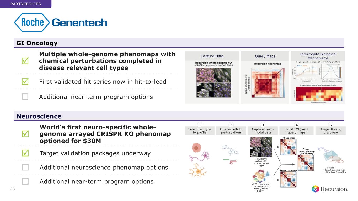 • 2000万美元预付款| > 6.5亿美元交易价值•专注于肿瘤学和免疫学肿瘤学和免疫学• 8000万美元预付款+投资|~1.5B美元总价值•专注于多达7个肿瘤学肿瘤学项目• 1亿美元预付款| > 5B美元总价值•专注于多达15个新的小分子候选者,横跨肿瘤学和免疫学肿瘤学和免疫学• 1.5亿美元预付款| 40个项目每个项目高达3亿美元•确定新的靶点和小分子,有可能推进多达40个神经科学项目和一个GI肿瘤学适应症。神经科学与肿瘤学22递归OS 1。来自这些治疗合作伙伴的预付款和里程碑付款注意:总交易价值可能包括项目里程碑(用于开发、商业化和净销售额)和净销售额的分级特许权使用费Pharma合作伙伴关系迄今已获得约450Q1美元,并有可能获得超过20B美元的额外里程碑