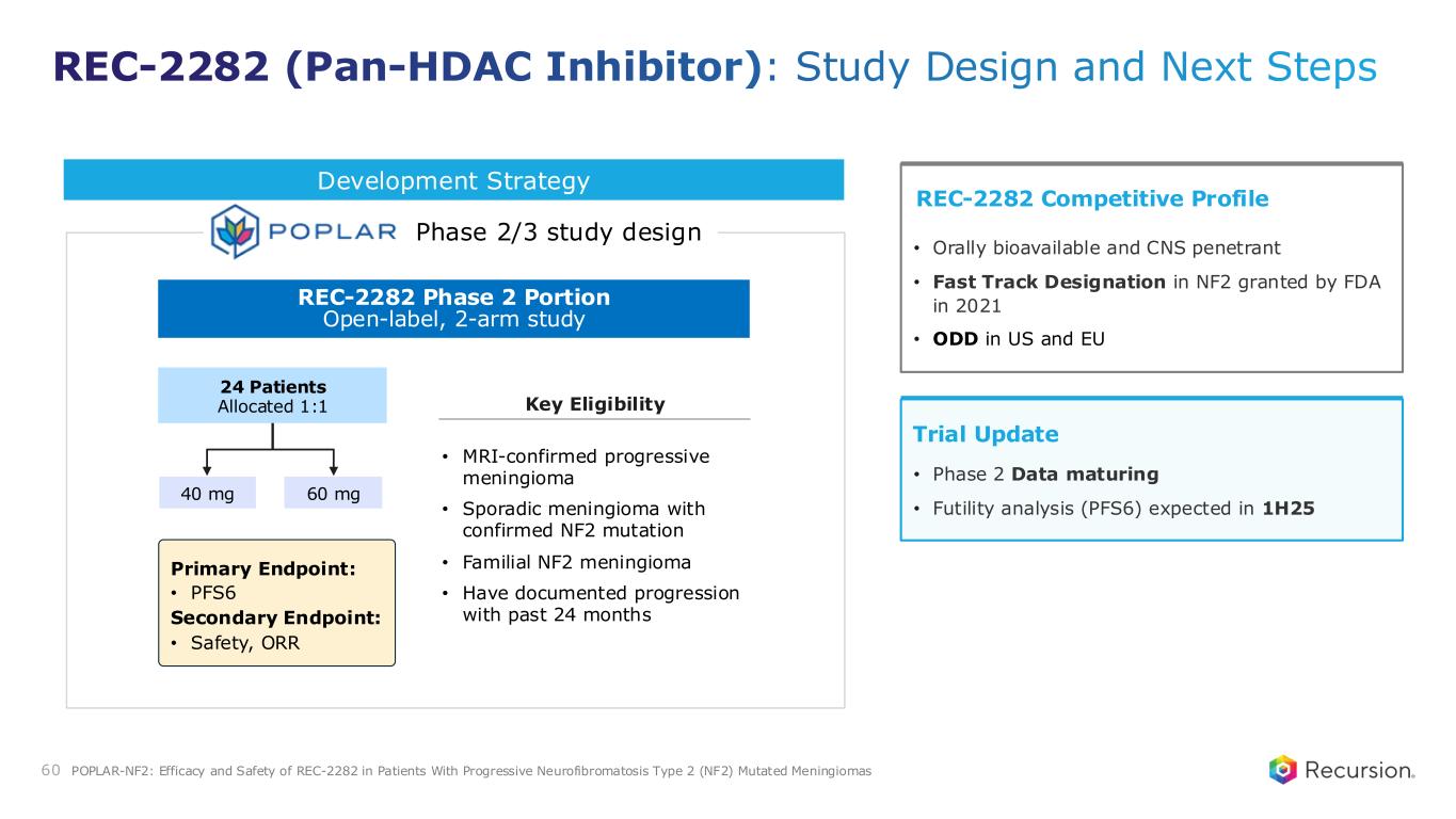 主要终点:• PFS6次要终点:•安全性,ORR REC-2282 Phase 2 portion open-label,2臂研究24名患者分配1:1 40毫克60毫克• MRI确认的进行性脑膜瘤•已确认NF2突变的散发性脑膜瘤•家族性NF2脑膜瘤•已记录过去24个月的进展60 POPLAR-NF2:REC-2282在进行性神经纤维瘤病2型(NF2)突变脑膜瘤发展战略患者中的疗效和安全性研究设计试验更新• 2期数据成熟•预计在1H25 REC-2282中的效用分析(PFS6)竞争特征•口服生物可及CNS渗透剂• FDA于2021年授予的NF2中的快速通道指定•美国ODD和欧盟关键资格REC-2282(泛HDAC抑制剂):研究设计和下一步