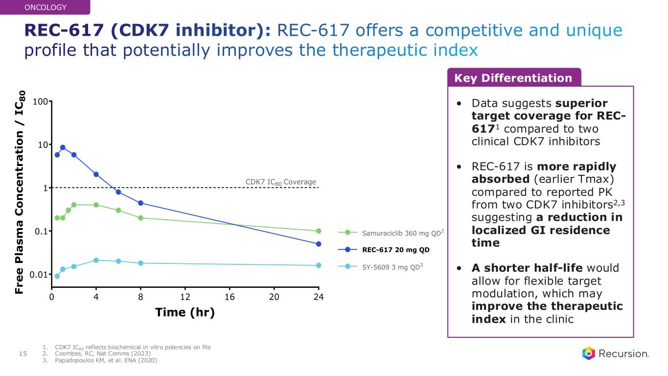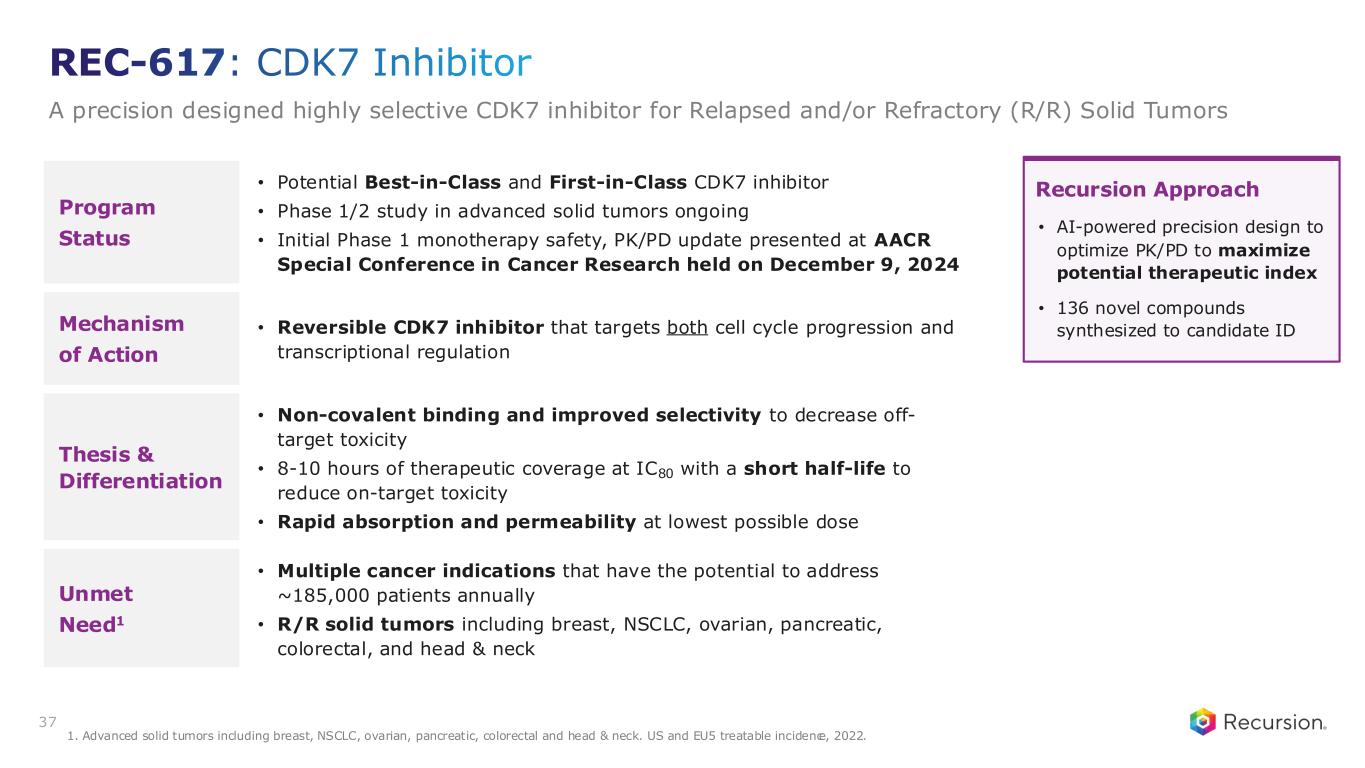 项目状态•潜在的同类最佳和一流CDK7抑制剂•晚期实体瘤的1/2期研究正在进行中•最初的1期单药治疗安全性,在12月9日举行的AACR癌症研究特别会议上介绍了PK/PD更新,2024作用机制•可逆CDK7抑制剂,同时靶向细胞周期进展和转录调控论文&分化•非共价结合和提高选择性以降低脱靶毒性•在IC80处进行8-10小时的治疗覆盖,半衰期短,以降低靶向毒性•以尽可能低的剂量快速吸收和渗透未满足需求1 •多个癌症适应症,每年有可能解决约185,000名患者• R/R实体瘤,包括乳腺、NSCLC、卵巢、胰腺、结直肠和头颈部371。晚期实体瘤包括乳腺、NSCLC、卵巢、胰腺、结直肠和头颈部。美国和EU5可治疗发病率,2022年。递归方法• AI驱动的精密设计,优化PK/PD,以最大限度地提高潜在治疗指数• 136种新化合物合成候选ID REC-617:CDK7抑制剂一种精密设计的高选择性CDK7抑制剂,用于复发和/或难治性(R/R)实体瘤